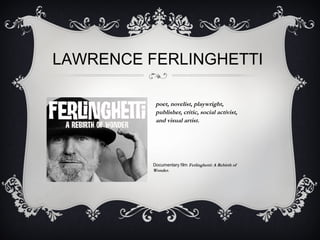 Lawrence Ferlinghetti was a poet, publisher, painter and social activist born in 1919 in New York. He served in World War II before earning degrees from the University of North Carolina, Columbia University, and the Sorbonne. In 1953, he co-founded City Lights Bookstore in San Francisco and its publishing arm, City Lights Publishers, which published seminal Beat Generation works like Allen Ginsberg's Howl and Other Poems and established Ferlinghetti as a leader of the Beat movement. As a poet, his most famous work is A Coney Island of the Mind, which has been translated into many languages. He also pursued a career in painting later in life.