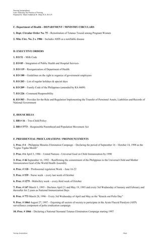 This document provides an overview of various laws and regulations affecting the practice of nursing in the Philippines. It lists presidential decrees, administrative orders, department circulars, executive orders, house bills, presidential proclamations, letters of instruction, republic acts, board of nursing resolutions, and relevant aspects of the 1987 Philippine Constitution. The document was prepared by Mark Fredderick R. Abejo R.N, M.A.N and covers a wide range of topics including healthcare staffing ratios, immunization requirements, healthcare rights, and ethics standards for nurses.