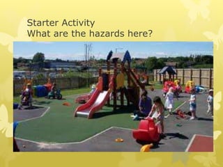 This document discusses health and safety legislation and guidelines relating to children. It covers topics like adult to child ratios, the Health and Safety at Work Act, RIDDOR reporting requirements, access to premises, OFSTED standards, COSHH regulations, food hygiene regulations, manual handling, hazards vs risks, risk assessments, accidents and emergencies, and completing forms for incidents. The purpose is to help students understand their responsibilities for keeping children safe and how legislation informs day to day practice.