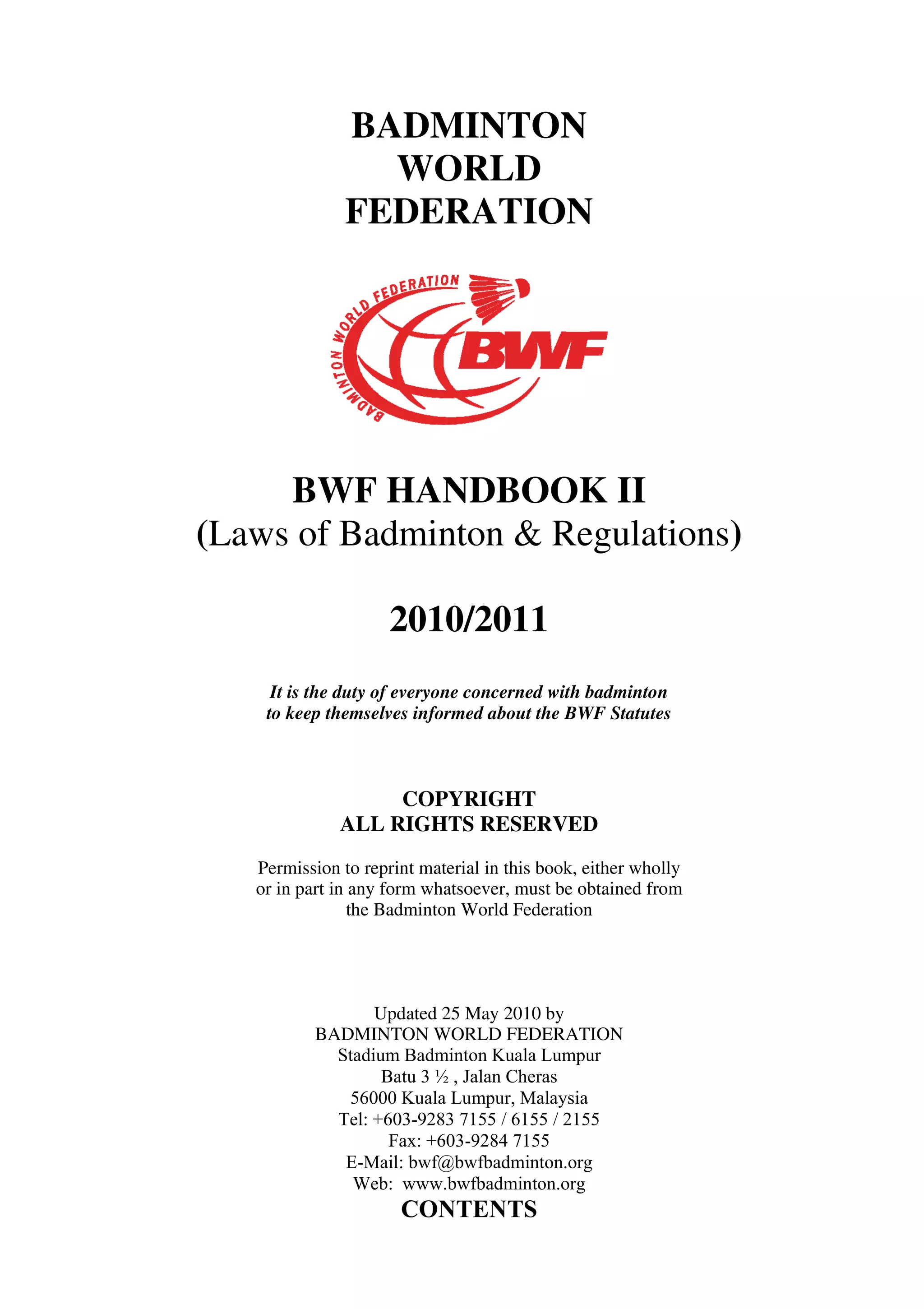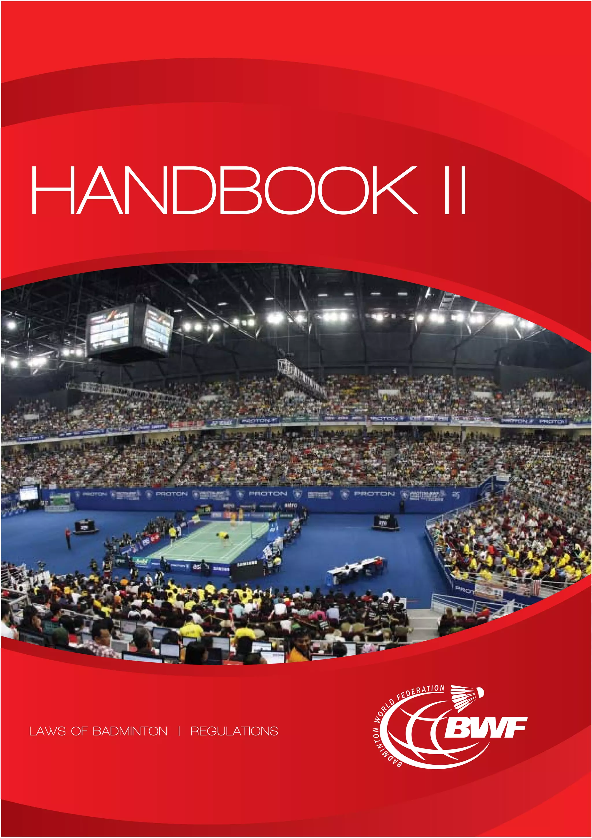 This document is the Badminton World Federation's Handbook II containing the Laws of Badminton and various regulations. It provides definitions for key badminton terms and outlines the specifications for equipment such as the court, shuttlecock, and racket. It also details the scoring system and rules regarding serves, foot faults, and the order of play in singles and doubles matches. The handbook serves as the official rulebook for the sport and guides tournament organizers on regulations.