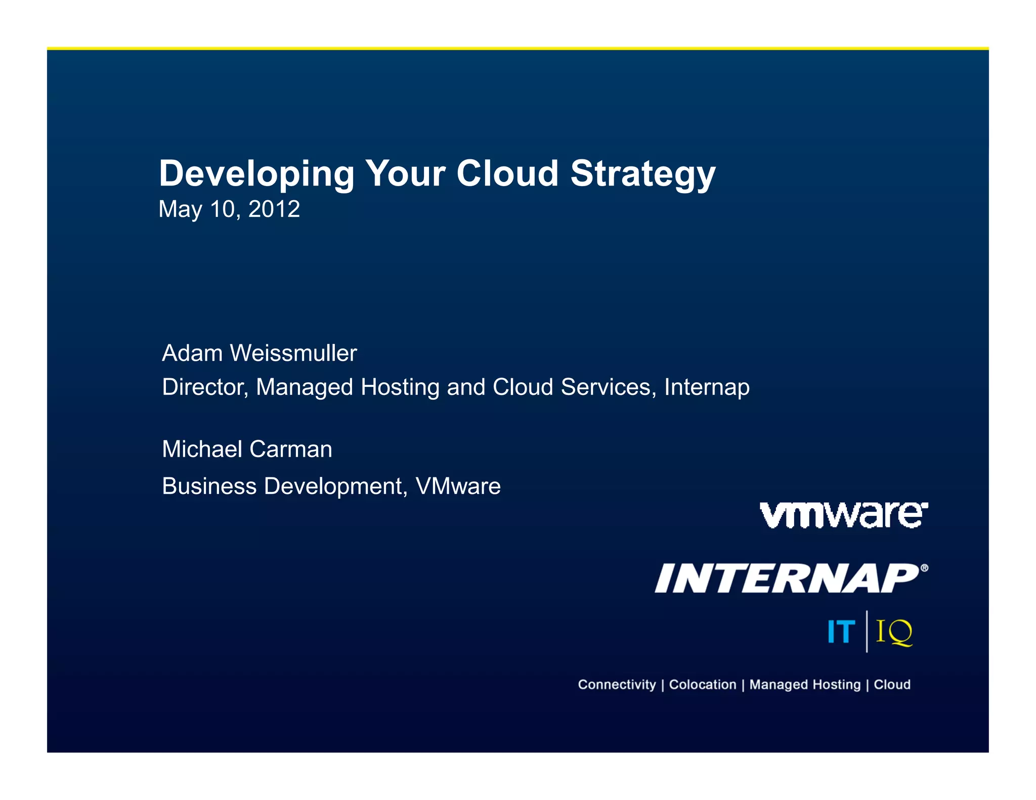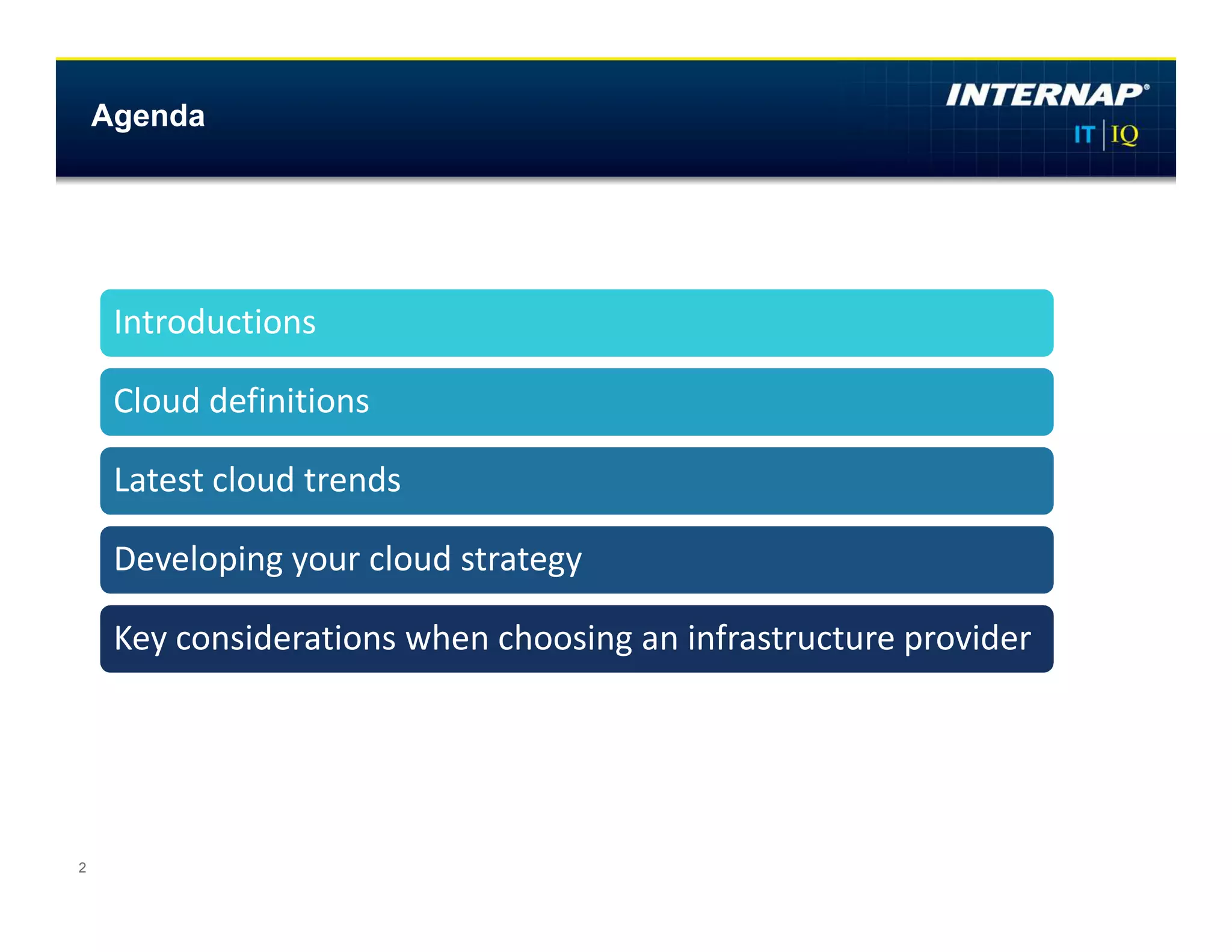 The document outlines strategies for developing a cloud computing approach, emphasizing the importance of balancing IT investments for business agility. It discusses various cloud service models, trends in cloud adoption, and the significance of selecting the right infrastructure provider. Key findings from a global study indicate a strong preference for high-performance, secure hybrid cloud solutions among enterprises, with a growing number planning or already adopting cloud services.