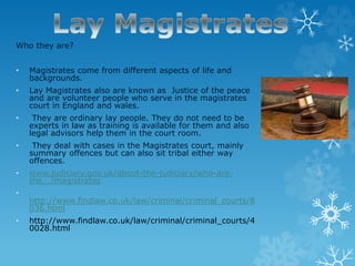 Magistrates are lay people from various backgrounds who volunteer to serve in magistrates' courts in England and Wales. They are not required to have legal expertise but receive training and assistance from legal advisors. Magistrates hear less serious criminal cases and can also deal with cases involving juveniles and family issues. However, magistrates have been criticized for not representing a broad cross-section of society and for being predominantly older, white, and male. Becoming a magistrate provides an opportunity to gain legal knowledge and experience while helping to serve one's local community.