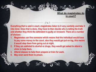 Magistrates listen carefully to everything said in court to determine the truth and decide if a defendant is guilty or innocent. Their choices include fining individuals, requiring alcohol/drug treatment, or job training classes. Magistrates can also send defendants to prison. No qualifications are required to become a magistrate, as full training is provided. Magistrates are volunteers and do not receive payment. Desired qualities include maturity, sound judgement, good character, social awareness, understanding, and communication skills. Magistrates must be between 18 and 70 years old and cannot have a criminal record or work in jobs like policing that could compromise impartiality. Magistrates deal with less serious crimes like theft, vandalism, fighting, public