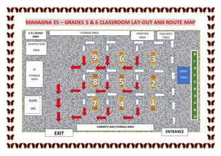 This document provides a layout and route map of a grades 5 and 6 classroom at Mahagna ES. The classroom layout includes labeled areas for an entrance, exit, teacher's table, reading area, printing area, storage areas, disinfection area, cabinets, blackboard, demo table, and community/wash area.