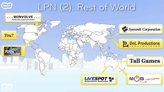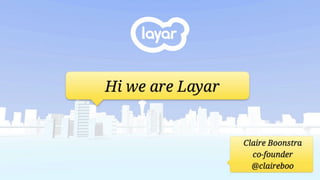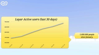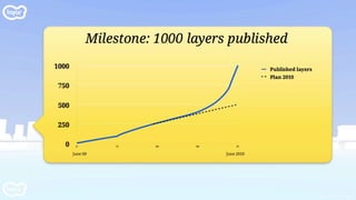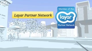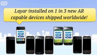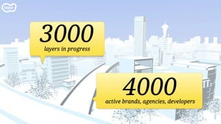 The document discusses various augmented reality (AR) projects and initiatives, including the 3D reconstruction of the Berlin Wall and marketing campaigns like the Rolling Stones' 'Exile on Your Street.' It highlights the development of layers for immersive AR experiences and virtual public art projects. Additionally, it notes the active user base for the platform, exceeding 800,000 in 2010.