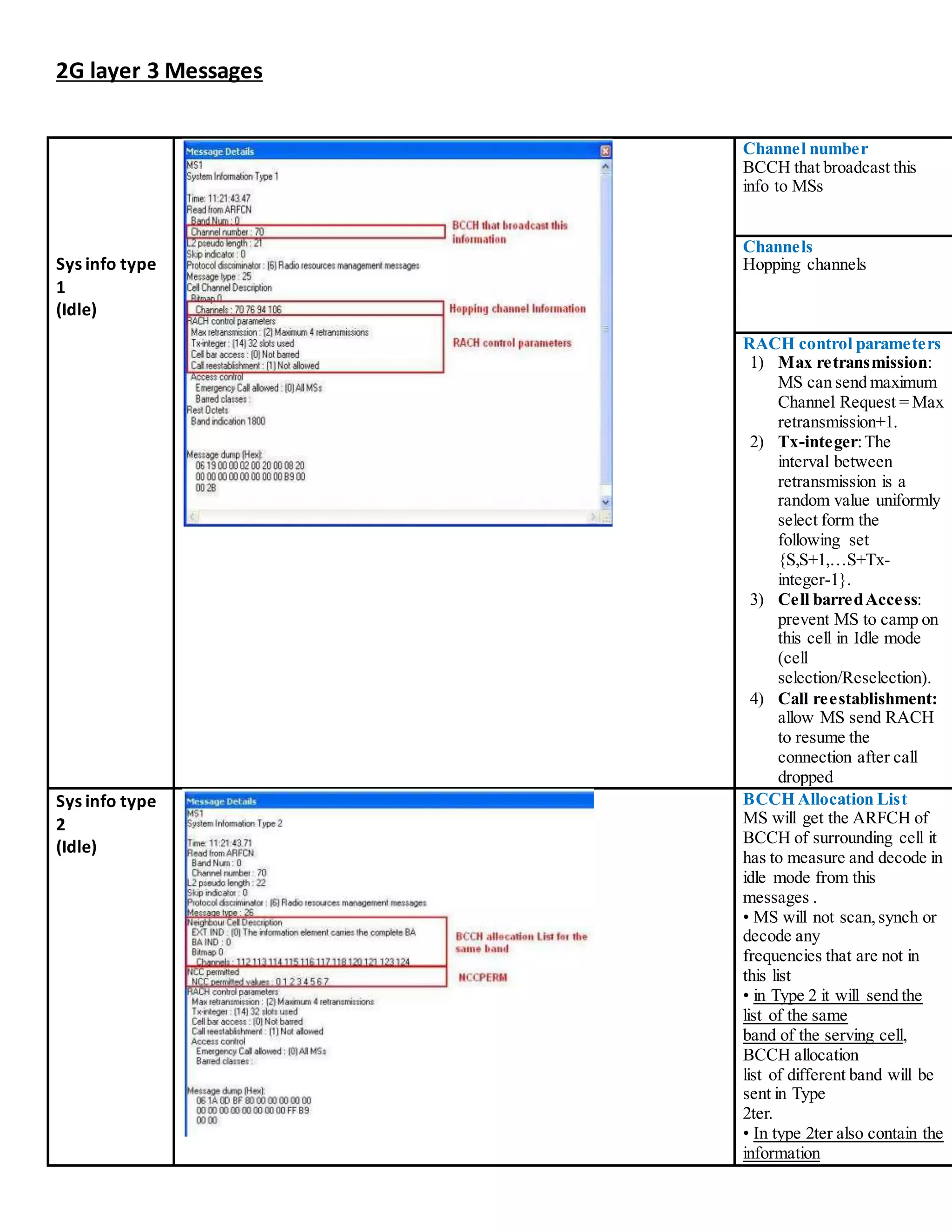 This document describes several 2G and 3G layer 3 messages including their purpose and key information elements. For 2G, it summarizes Sys info types 1-6 which broadcast system information to mobile stations in idle and dedicated modes, including things like channel allocation and cell parameters. It also describes messages like Measurement Report, Immediate Assignment, and Handover Command that are used for handover and connection management. For 3G, it lists 21 different message types like Measurement Report and Active Set Update used for mobility management and connection control.