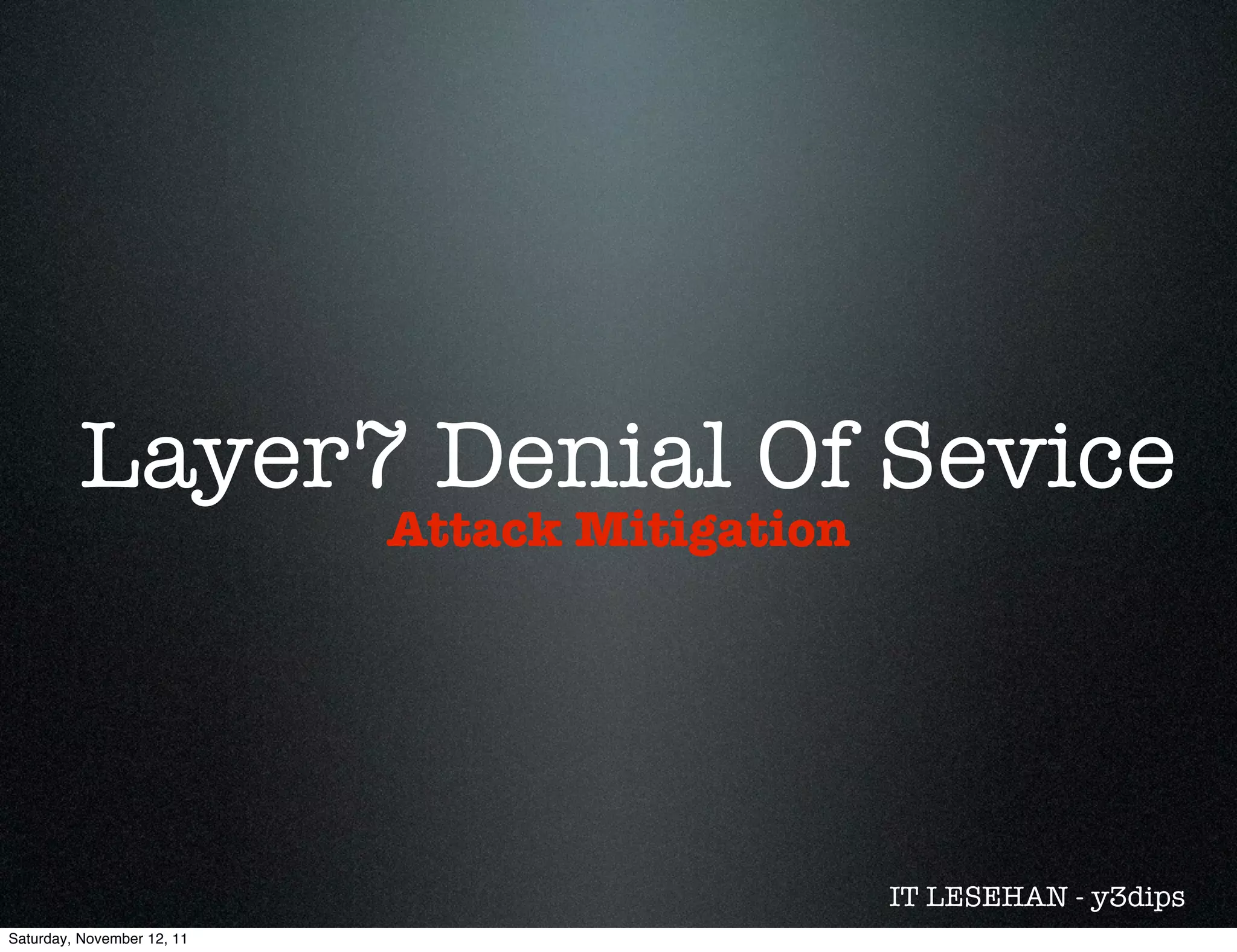 This document discusses layer 7 denial of service attacks and mitigation techniques. It describes how layer 7 attacks target application layer protocols like HTTP and FTP to overwhelm servers. The document then provides an example of an HTTP flood attack against a website and the steps taken to analyze logs and implement mitigation like rate limiting, timeouts, and firewall rules. Effective mitigation requires identifying attacks, hardening servers, and contacting authorities.