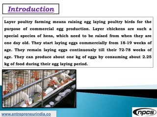 Layer poultry farming involves raising egg-laying chickens commercially for egg production. It is gaining popularity in India due to lower costs and growing egg demand. The key states for layer farming are Andhra Pradesh, Tamil Nadu, Haryana, Maharashtra, and Punjab. Layer farming provides benefits such as rapid returns, continuous income source, and use of agricultural byproducts as feed. Proper farm management is required to maximize egg production over the layers' lifespan from 18-78 weeks of age. India is the third largest egg producer globally but still has opportunities for growth as per capita consumption is still lower than developed countries.