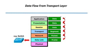 The document discusses the application layer of the OSI model, detailing its functions including user interface, communication services, and network resource access. It outlines various protocols such as HTTP, FTP, SMTP, and others that facilitate email, web browsing, and file transfers while highlighting challenges like security and data integrity. Additionally, it covers the presentation and session layers, emphasizing their roles in data translation, encryption, and managing communication sessions.