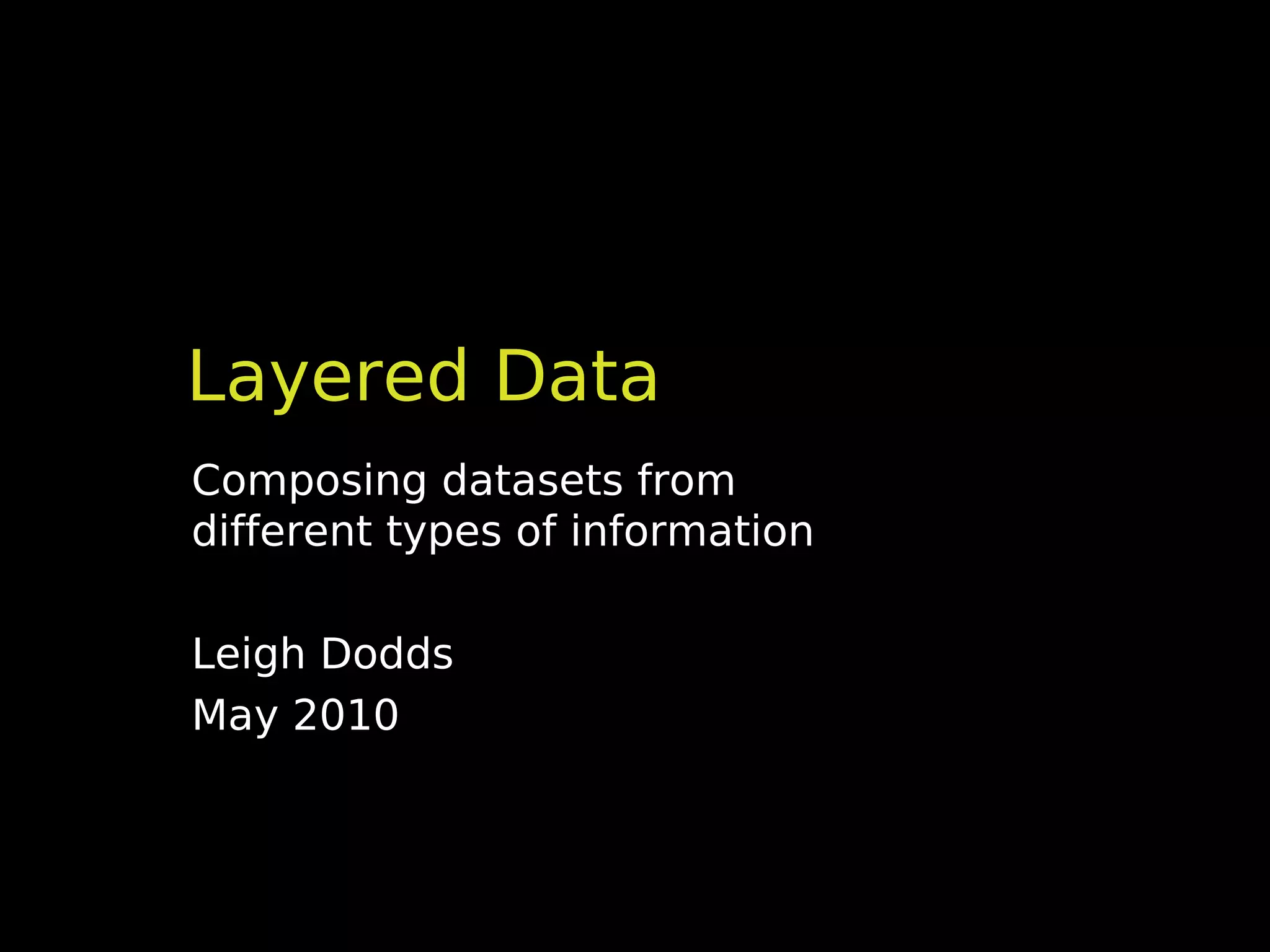The document describes how a layered dataset is constructed by combining different types of information. It discusses initial factual data layers, network connections between resources, third-party commentary, content organization, and a final composite data layer created by combining the five distinct component layers. Each layer remains identifiable within the combined dataset.