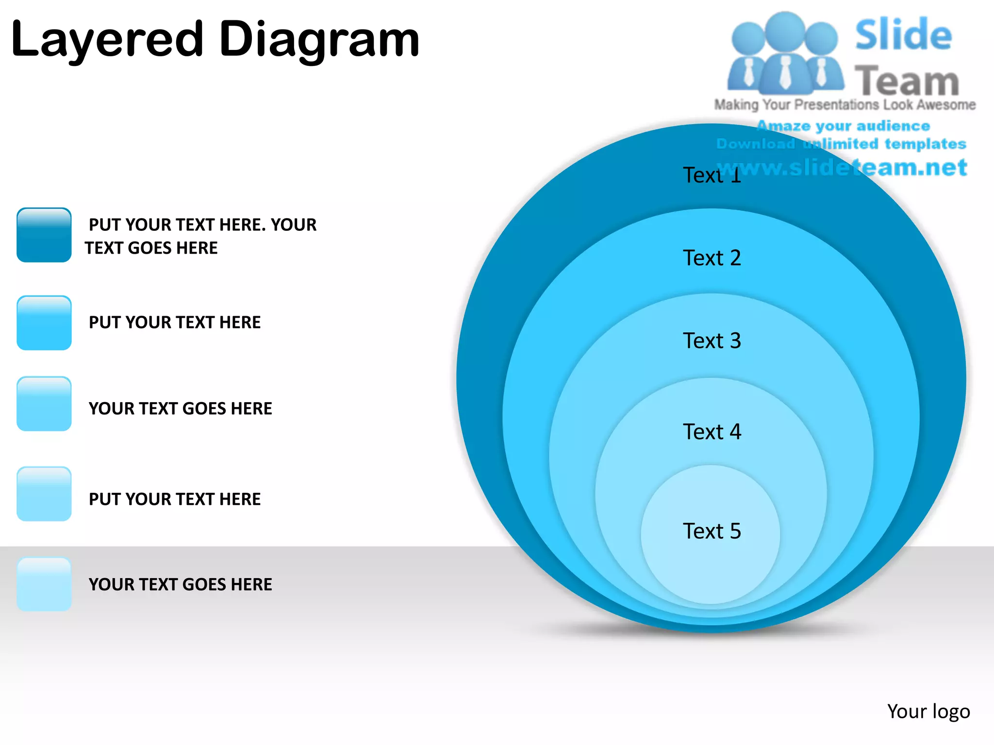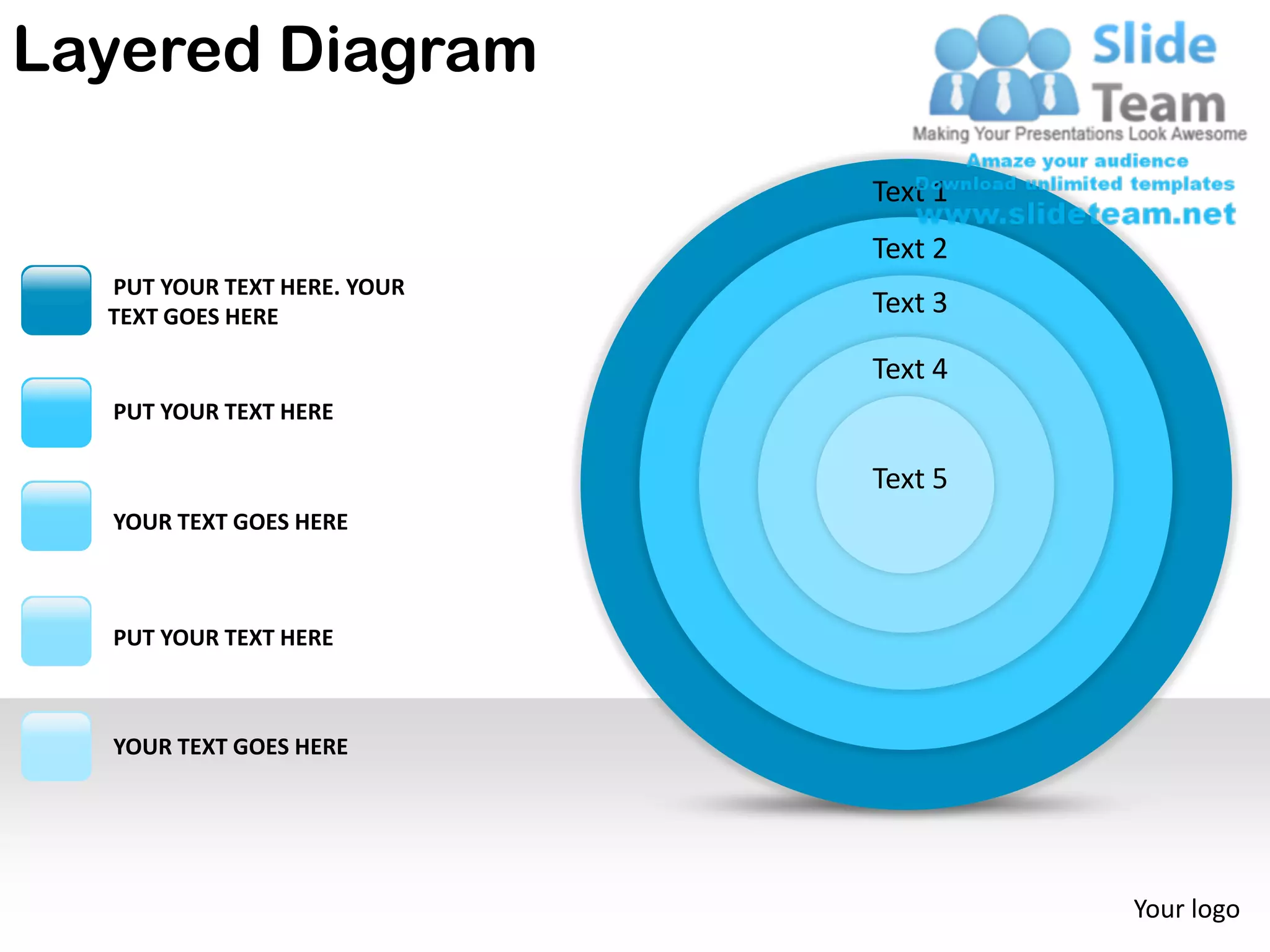 The document contains instructions for editing a layered diagram template. It includes multiple pages with examples of layered diagrams that contain placeholder text. The diagrams demonstrate how to arrange text boxes in layers and include images. Text in the document provides directions for customizing the color, size, and orientation of icons in the template as well as ungrouping objects and changing their color.