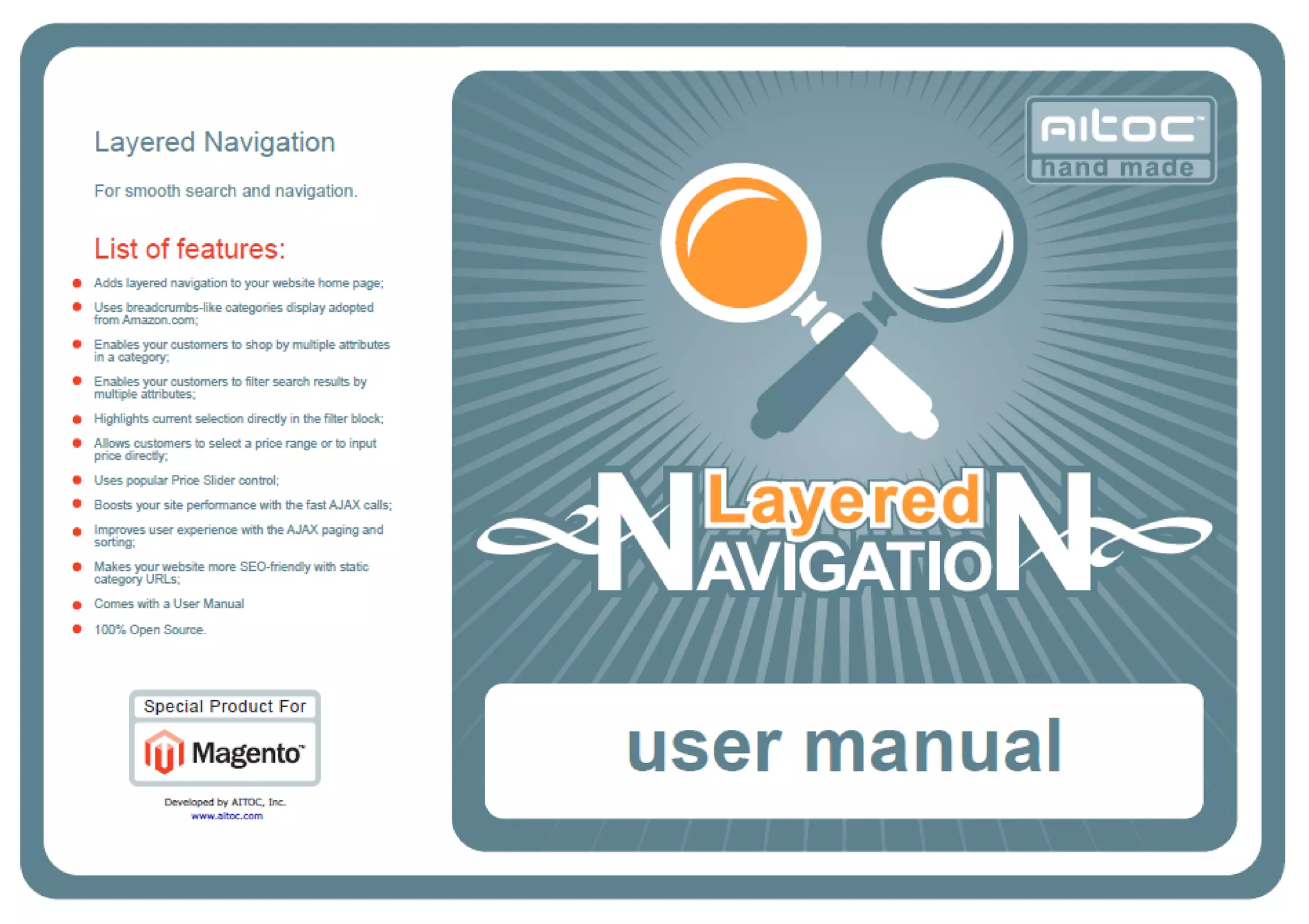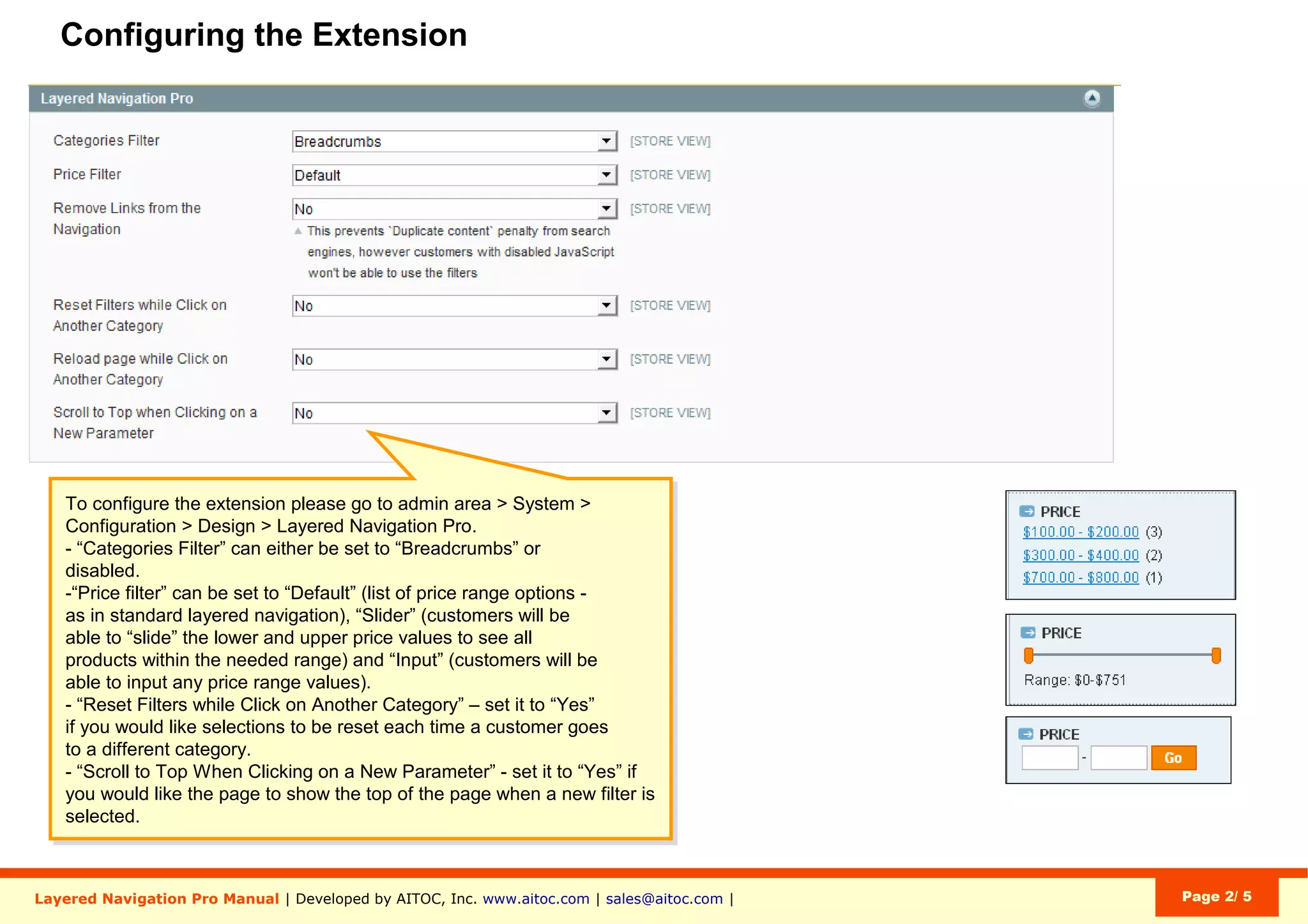 The Layered Navigation Pro User Manual for Magento provides detailed instructions on enabling and configuring the extension, including display settings, attribute visualization, and color swatch settings. Users can customize navigation filters, pricing displays, and pagination features, as well as add visual attributes for better product representation. Additional resources such as installation guides, demo links, and contact information for support are also included.