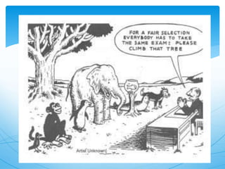 Differentiated instruction aims to create multiple paths for students of varying abilities and interests to learn effectively. It involves proactively planning varied approaches to content, process and products based on formative assessments of student needs. The goals are for every student to make continuous progress at their level and become lifelong learners. Teachers differentiate by modifying content, process and products based on student readiness, interests and learning profiles to increase the likelihood that each student learns as much as possible.