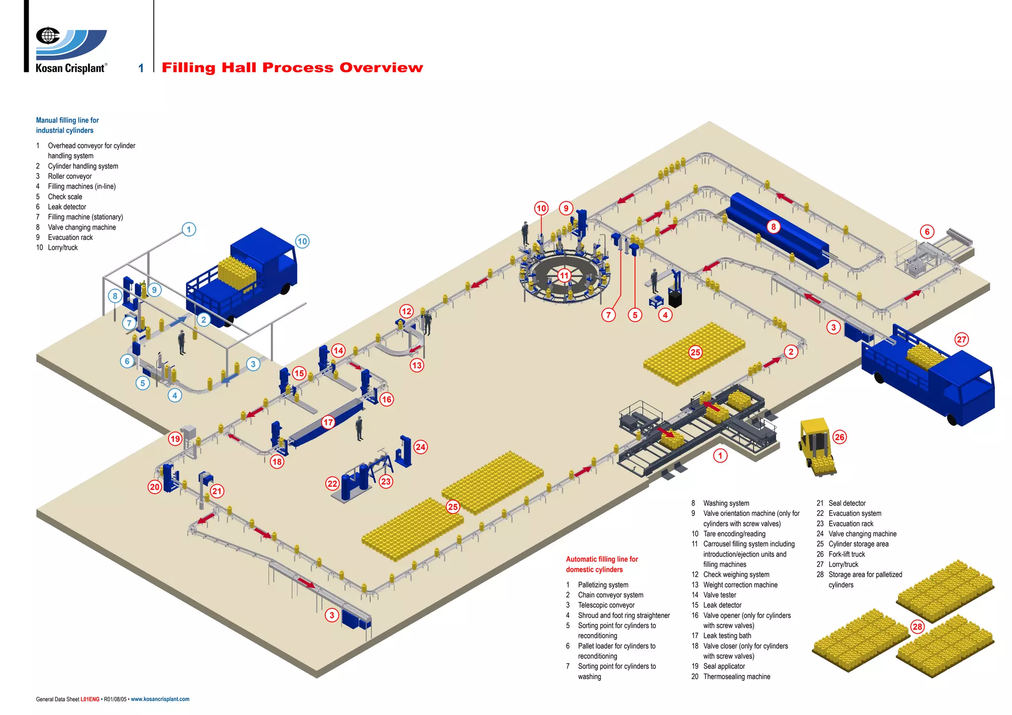 The document provides an overview of the filling hall process for both manual and automatic filling lines for industrial and domestic cylinders. It includes a diagram showing the key steps and equipment involved, which are: 1) cylinder handling systems, 2) filling machines, 3) quality checks like scale checks and leak detection, and 4) additional processes like valve changing and evacuation. The goal is to fill cylinders efficiently and ensure quality.