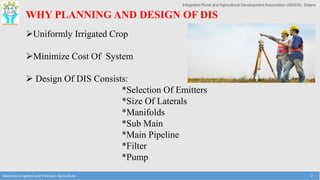 This document discusses the layout and design of drip irrigation systems. It describes the key steps in the design process, which include collecting data on water resources, land, climate and crops. It also covers computing peak crop water requirements, selecting appropriate emitters, and hydraulically designing the pipe network and determining the required pump horsepower. The document provides examples of different drip irrigation system layouts and considerations for selection of emitters and arrangement along laterals. It aims to explain how to plan and design drip irrigation systems for uniform crop irrigation while minimizing costs.