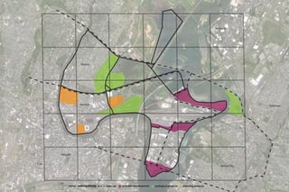 This map shows a region in New Jersey with the towns of Secaucus, Kearny, Harrison, Hoboken, Newark, and Jersey City. It highlights areas for potential walking/biking paths, light rail expansion, development projects, and ecological and planning projects across the different municipalities in under a mile from each other.