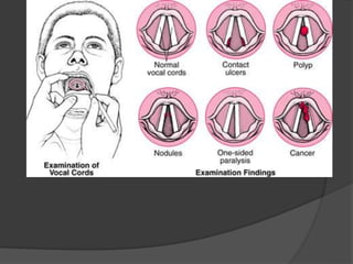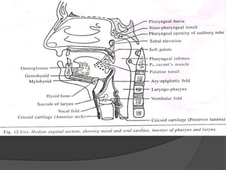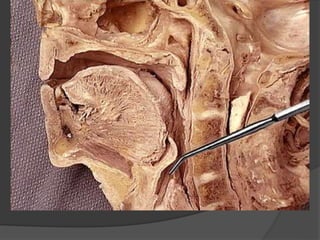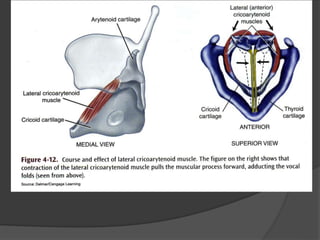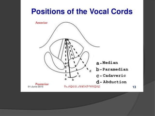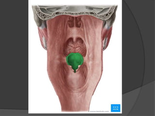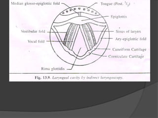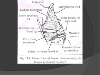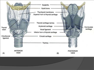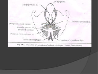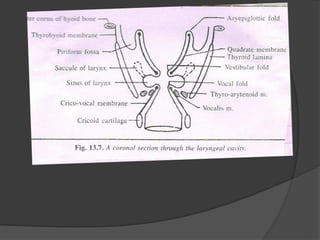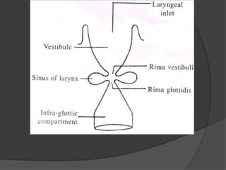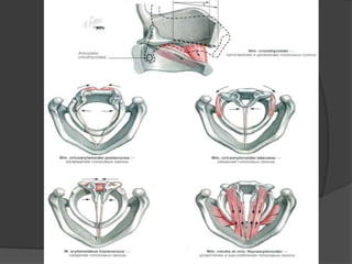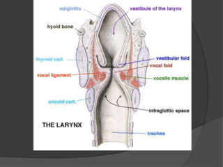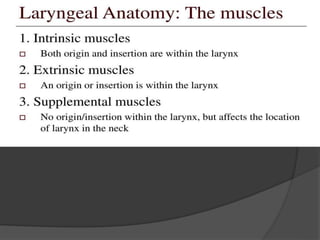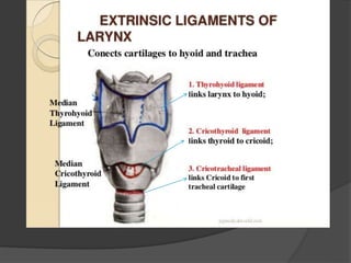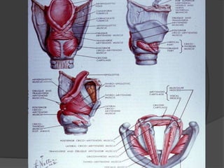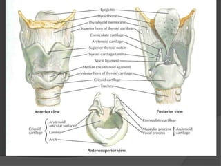 The document summarizes the anatomy of the larynx. It describes the cartilages that make up the larynx, including the epiglottis, thyroid, cricoid, and arytenoid cartilages. It discusses the ligaments, muscles, blood supply, nerve supply, and movements of the larynx. Key structures mentioned include the vocal folds, which divide the larynx into supraglottic and infraglottic regions. The recurrent laryngeal nerve is described as the main motor nerve to the laryngeal muscles, except for the cricothyroid muscle.