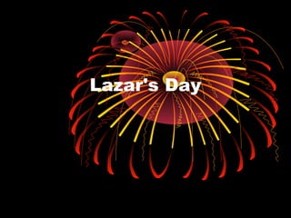 Lazar's Day is celebrated on the eighth day before Easter and involves young women called "lazarki" going from house to house singing songs and blessings for health, happiness, and prosperity. They pick flowers to make wreaths for Palm Sunday the following day as part of the Lazaruvane custom. The festival brings a spring mood and sense of looking forward to both participants and residents, and it was traditionally believed that girls had to take part in the rituals in order to get married.