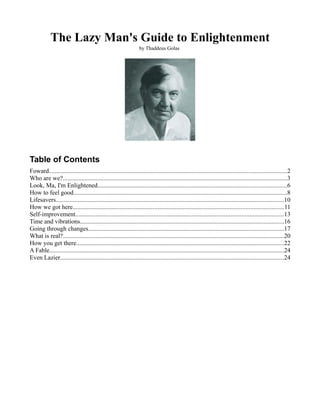 This document provides a summary of "The Lazy Man's Guide to Enlightenment" by Thaddeus Golas. It introduces the key idea that the universe is made up of one type of entity, each determining their own existence through expanding and contracting. When fully expanded, entities experience total awareness and bliss as space/God. When contracted, they experience limitations as mass/particles. By alternating expansion and contraction, entities exist as energy in between those states. The universe consists of beings vibrating at different ratios across a range of experiences.