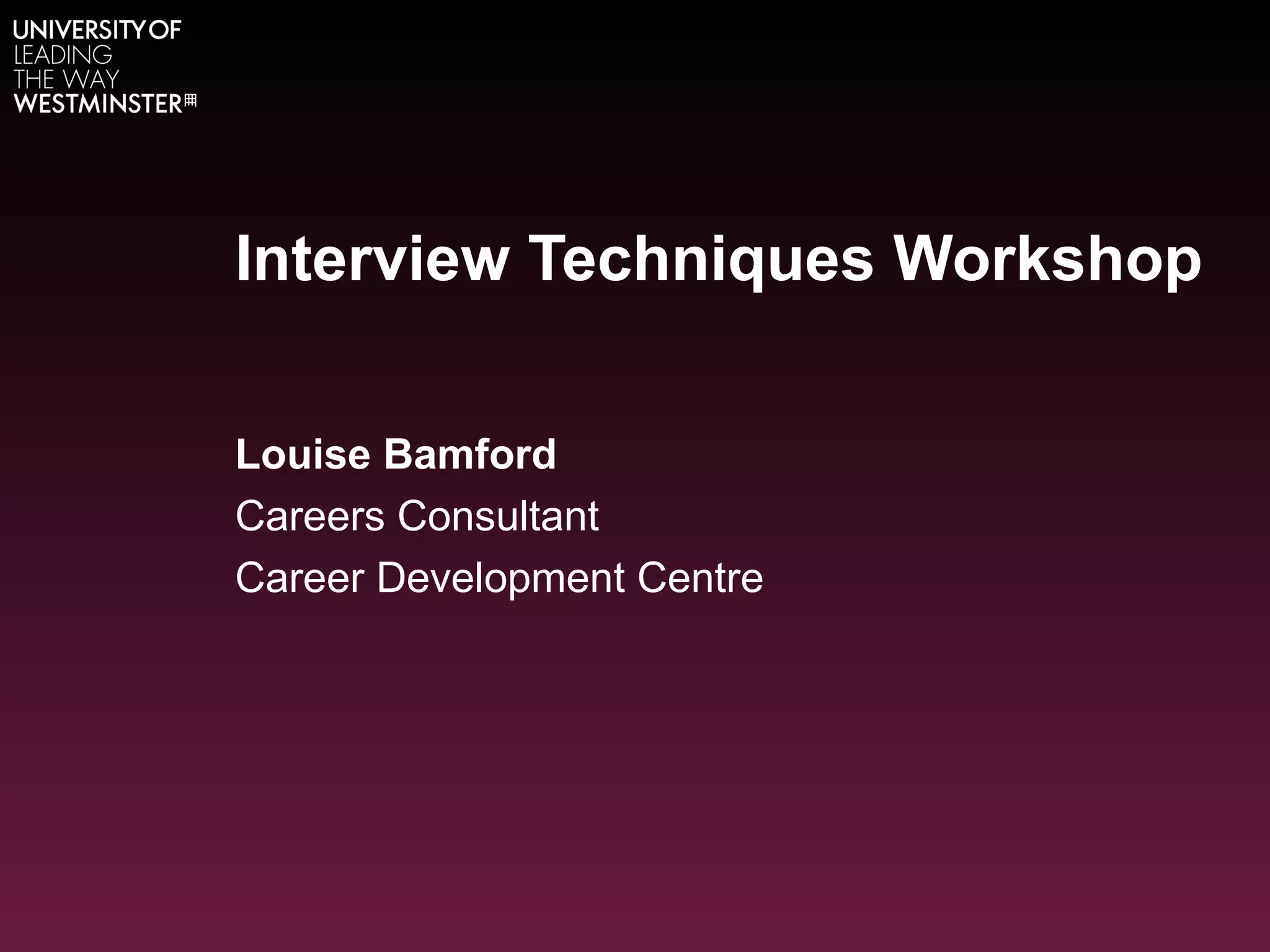 The workshop aims to help participants prepare for interviews by outlining best practices, exploring employer expectations, sharing interview experiences, assessing confidence levels, and practicing interview questions. The content includes what to do before an interview, the interview format, what employers look for, interview behavior, common questions, and tips. Preparation is emphasized as the key to success and involves researching yourself, the job, and the organization as well as rehearsing answers. Employers seek candidates who can do the job, want to do the job, and will fit in based on skills, motivation, and personal qualities.