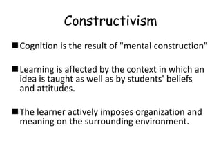The document discusses sociocultural theory of cognitive development, which posits that cognition is shaped by social and cultural contexts. It focuses on Vygotsky's view that cognitive development occurs through interactions with others and the use of cultural tools like language. A key concept is the Zone of Proximal Development, which is the difference between what a child can do independently versus with guidance, and represents the child's potential development. Within the ZPD, scaffolding from a more knowledgeable person can help a child learn skills they are not yet able to master alone.