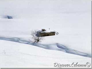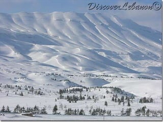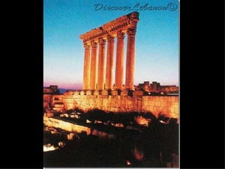 The document provides images and descriptions of various historical and natural landmarks across Lebanon, including mountains, caves, temples, ruins, cities, and landscapes. Some of the places mentioned are the Cedars of Lebanon, Jeita Grotto caves, Baalbeck temples, Anjar ruins, Jounieh, Saida, Byblos ruins and port, and Tyre ruins and Hippodrome. The document also provides details about Roman-era columns and structures in the old harbor of Jbeil.
