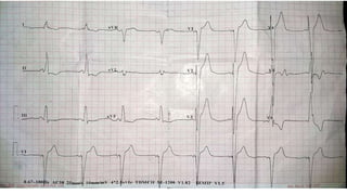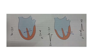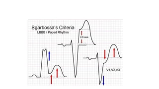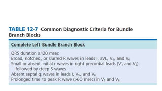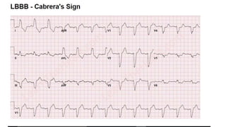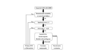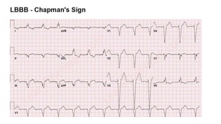 This document discusses left bundle branch block (LBBB) and how it affects electrocardiogram (ECG) patterns, making the diagnosis of myocardial infarction (MI) more complicated. Key points: