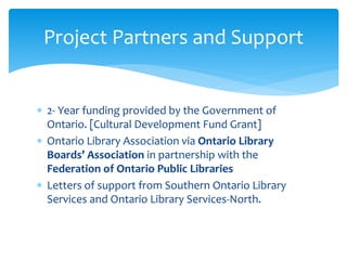 This document outlines a two-year project called "The Cultural Development Fund Project" or "Leadership by Design: The Next Generation" funded by the Government of Ontario to strengthen public library board performance across the province. The project will create a four-year learning cycle of online modules for board development building on previous Leadership by Design resources. In year one, the project will create a learning plan and framework and develop the first module on orientation topics like roles, responsibilities, and understanding the community.