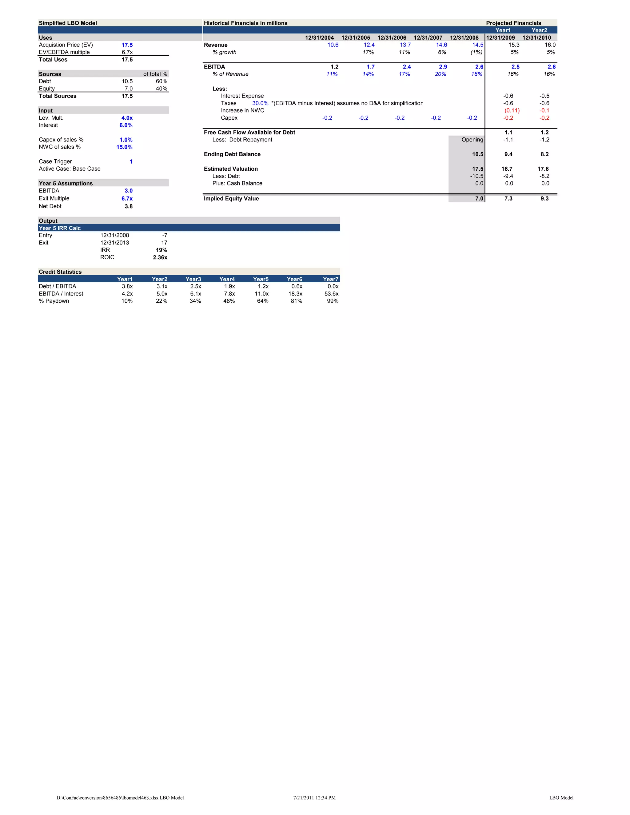 The document presents a simplified LBO model for acquiring a company for $17.5 million. It shows historical and projected financials including revenue, EBITDA, debt levels, and implied equity value over time. The acquisition is expected to generate a 19% IRR and pay down debt aggressively over 7 years until the company is eventually sold for an estimated $22.3 million, implying a 2.36x return on invested capital.