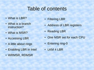 The document explains how to access Last Branch Record (LBR) contents on Intel x86 through a Linux kernel module, detailing concepts such as last branch records, branch instructions, and model-specific registers (MSRs). It describes the steps to enable LBR, including setting specific MSRs, filtering LBR for user-space branches, and illustrates reading LBR using assembly code within a kernel module context. The document is highly technical, targeting developers interested in low-level CPU monitoring techniques.