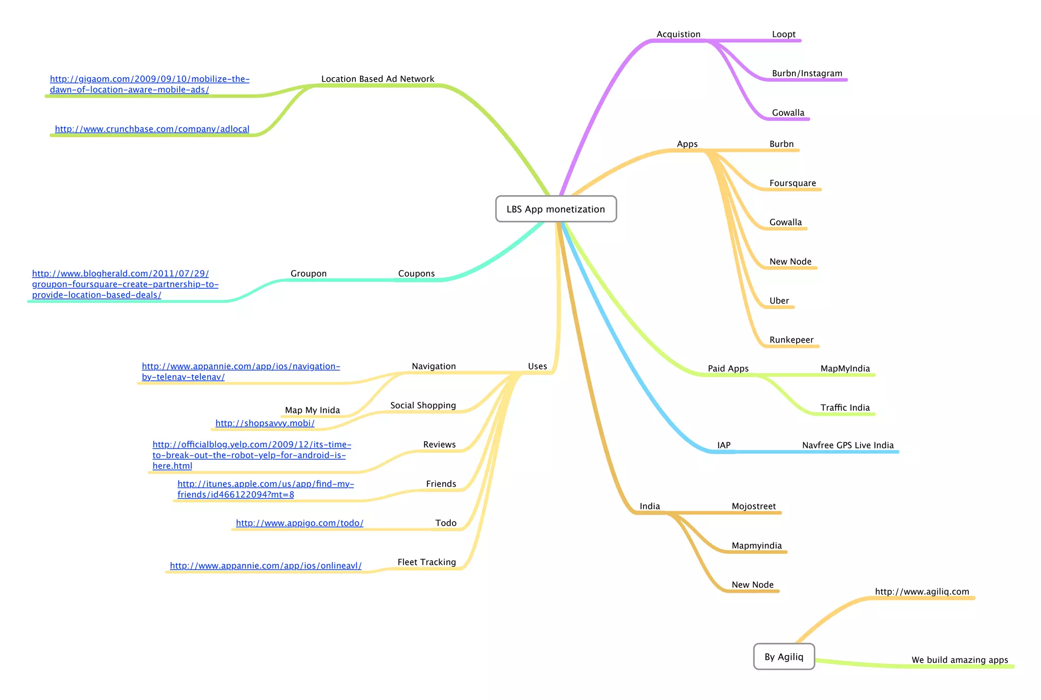 This document lists various mobile apps and companies related to location-based services and advertising. It mentions location-based ad networks like AdLocal and companies that have been acquired like Loopt that helped pioneer location-aware mobile advertising. It also lists popular location-based social apps from the past like Foursquare, Gowalla and Burbn as well as current platforms and how some have partnered with companies like Groupon to offer local deals. Finally, it mentions examples of location-based app categories and companies in India like MapMyIndia, Navfree and MojoStreet.