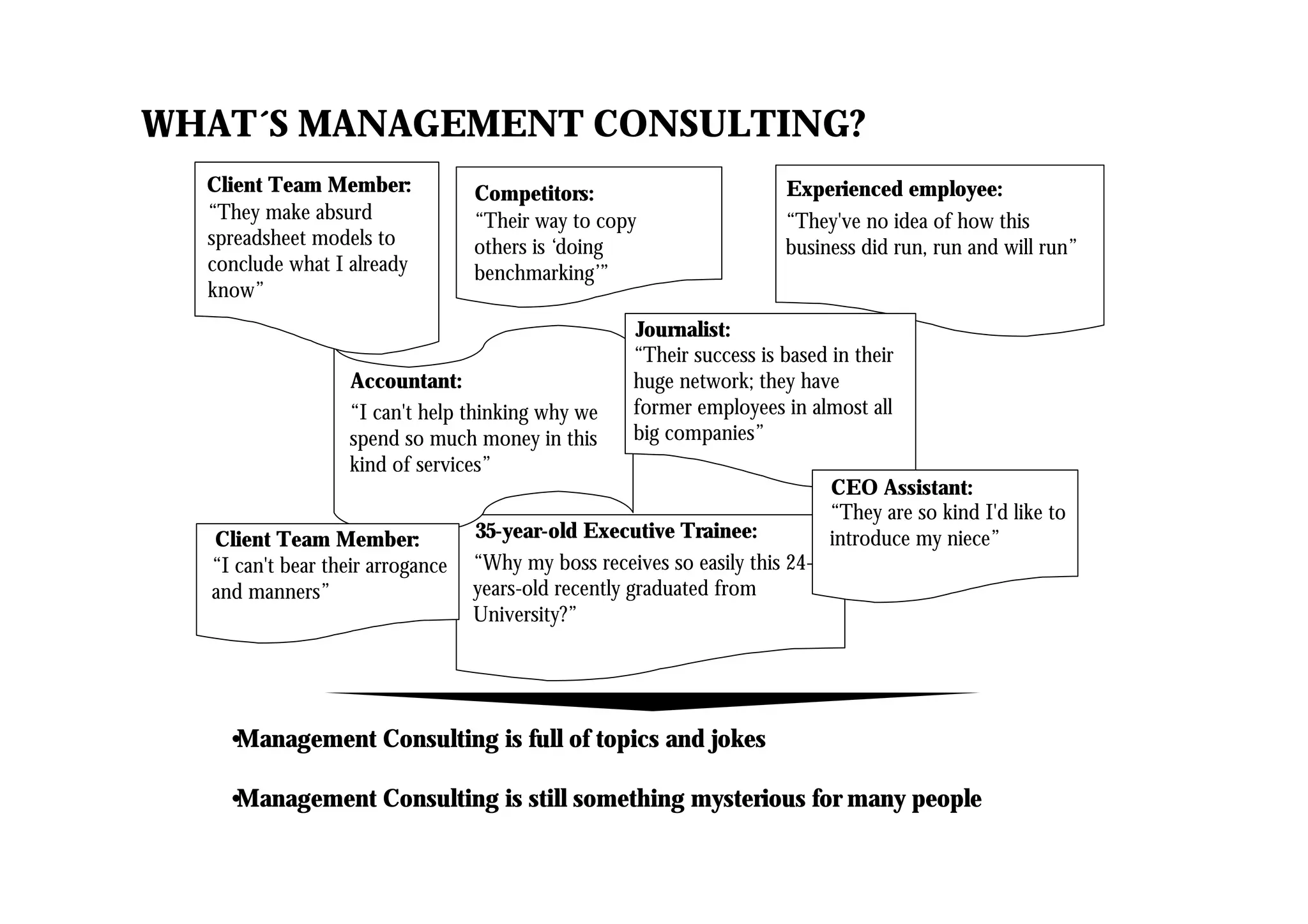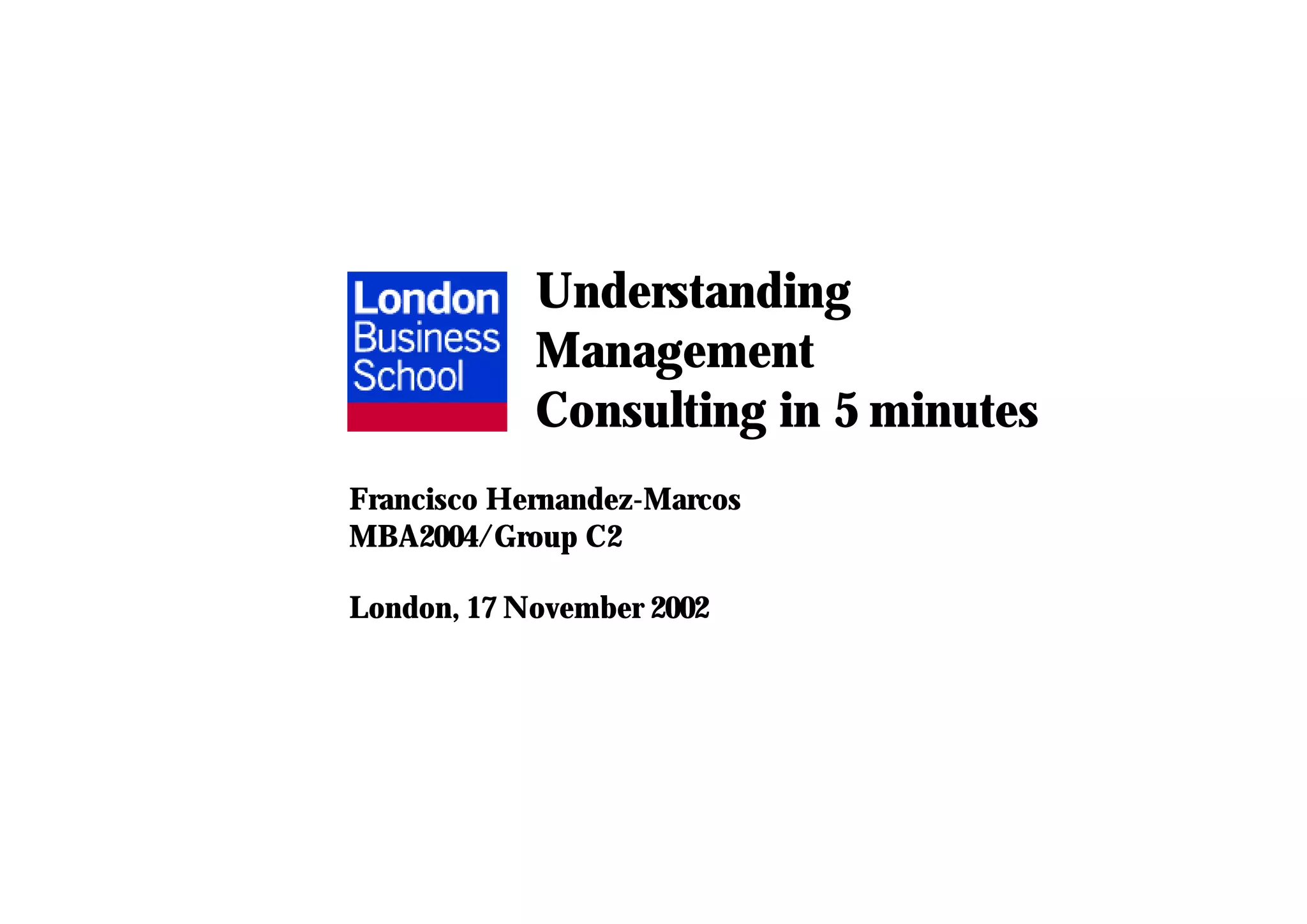 Management consulting involves advising clients on business challenges. Consultants conduct research, analysis, and make recommendations to clients. Common challenges include restructuring business units, determining which branches to close, or developing new strategies. While clients benefit from an outside perspective, some see consultants as arrogant or creating unnecessary work. Effective consulting requires understanding the client's business and priorities, as well as involving client team members throughout the process. The dynamic business environment drives demand for consultants to help companies address new challenges.