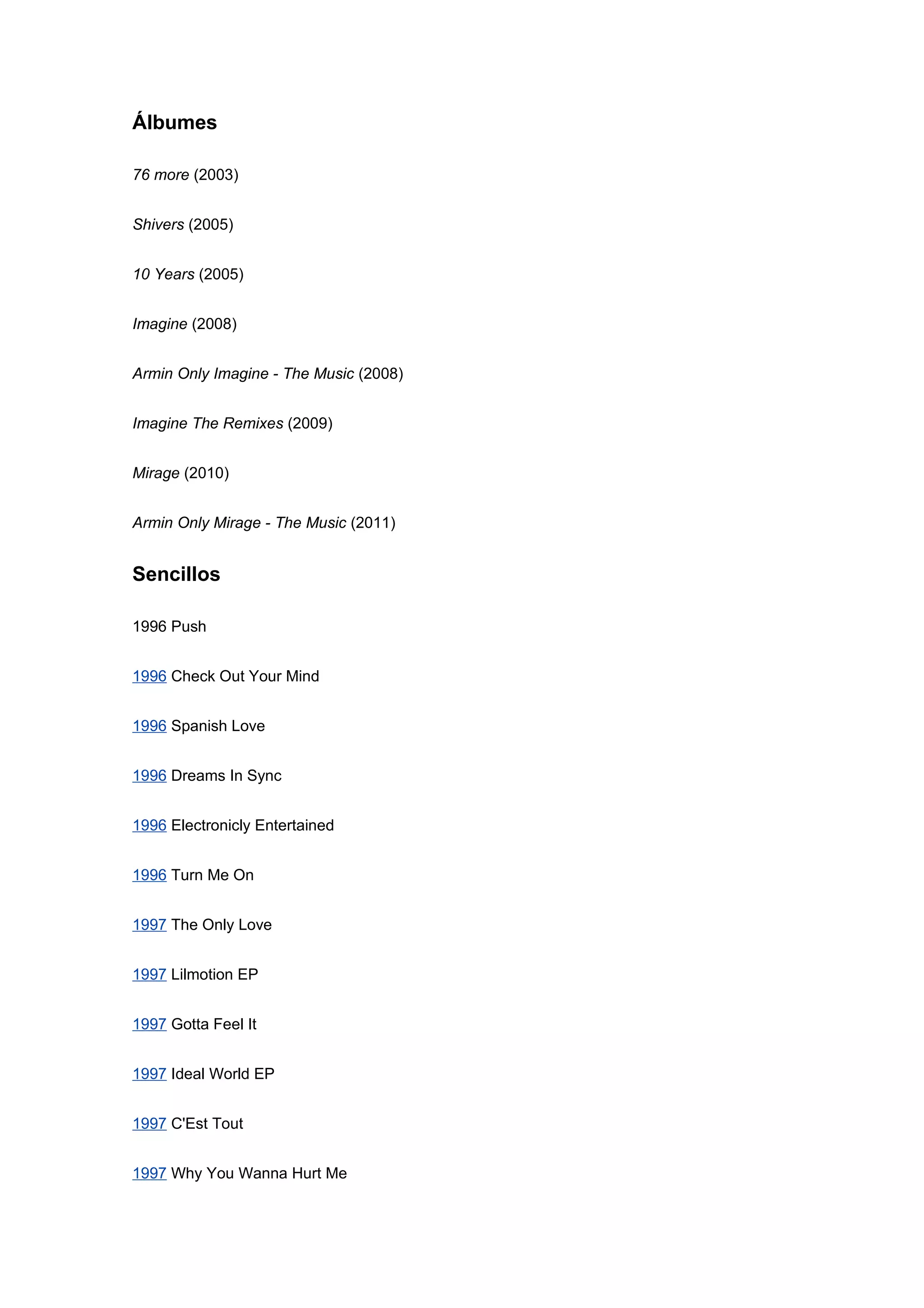 This document lists albums, singles, remixes, and DJ compilations by Armin van Buuren from 1996 to 2011. It includes the titles of 76 albums, over 100 singles, over 100 remixes, and compilation series such as A State of Trance, Universal Religion, and A State of Trance Radio Top 15. The discography spans Armin van Buuren's entire career and covers many different releases over 15 years.