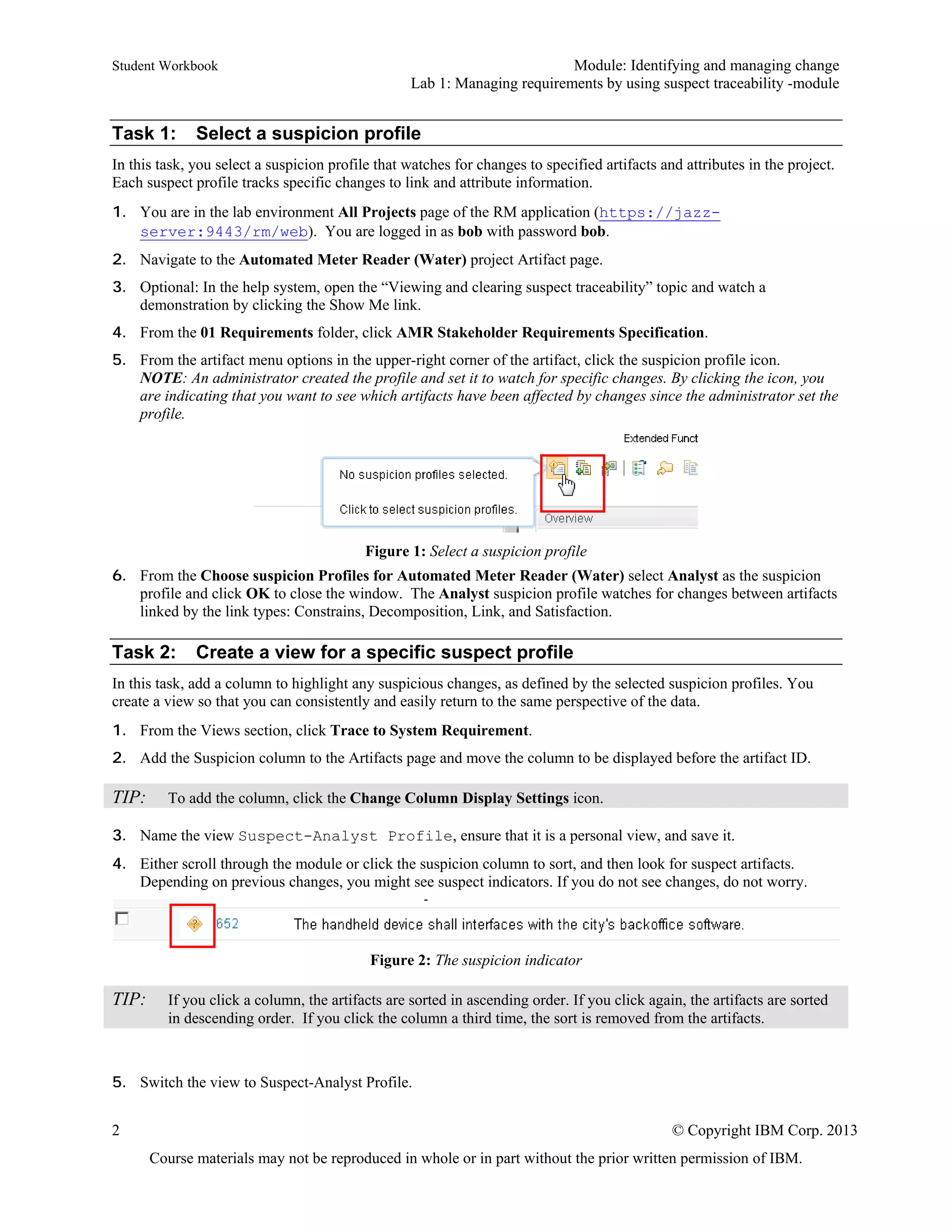The document outlines a lab module focused on managing requirements through suspect traceability for an automated meter reader (AMR) project. It includes objectives, tasks for selecting suspicion profiles, creating views for specific profiles, changing artifacts, and assessing the impact of those changes. The lab aims to teach the impact assessment of changes on artifacts through the use of a traceability system.