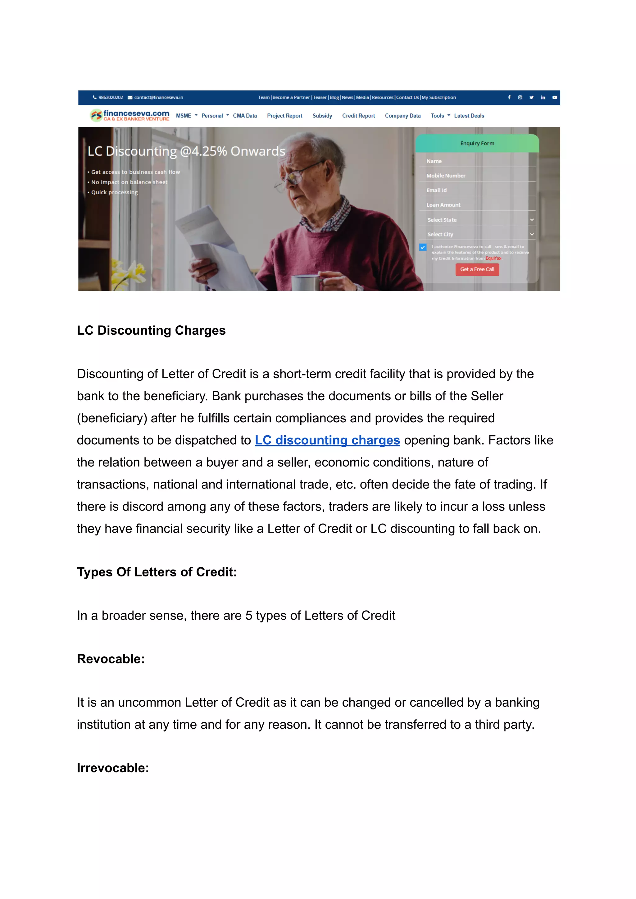 The document discusses letter of credit (LC) discounting charges, highlighting it as a short-term credit facility provided by banks to sellers after compliance with requirements. It categorizes LCs into five types: revocable, irrevocable, transferable, confirmed, and unconfirmed, each with distinct characteristics and security levels. Additionally, it mentions other forms of LCs such as standby, revolving, and back-to-back letters of credit.