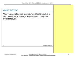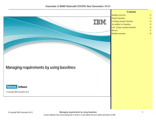 This document outlines how to manage requirements using baselines in IBM® Rational® DOORS Next Generation v4.01. It explains the creation and significance of project baselines, which capture the state of a project at specific moments, including all artifacts and folder trees. The material provides guidelines for creating baselines, the permissions needed, and the differences between baselines and artifact revisions.