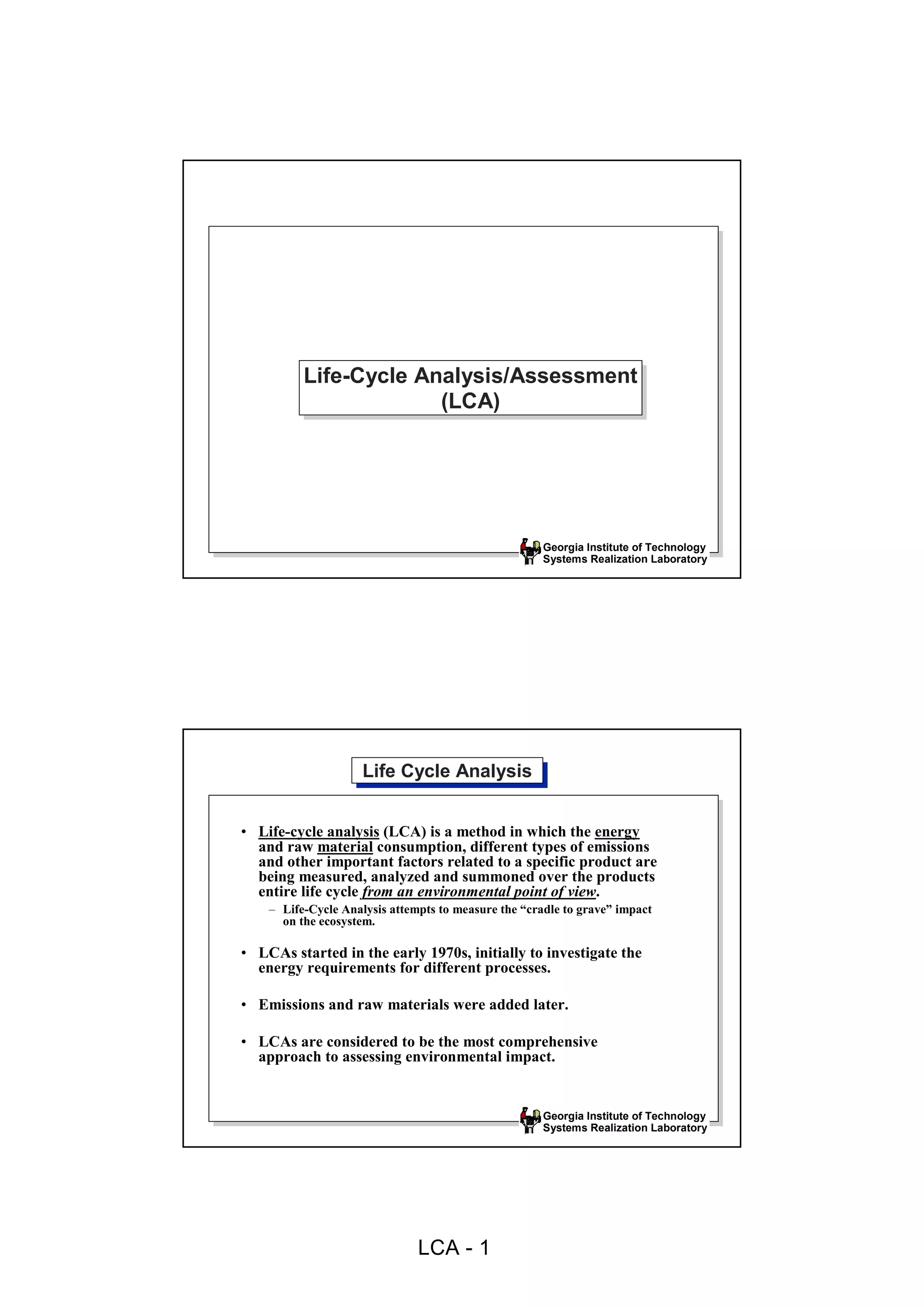 1) Life-cycle analysis (LCA) is a method that measures the environmental impact of a product over its entire lifespan, from material sourcing through end of life.