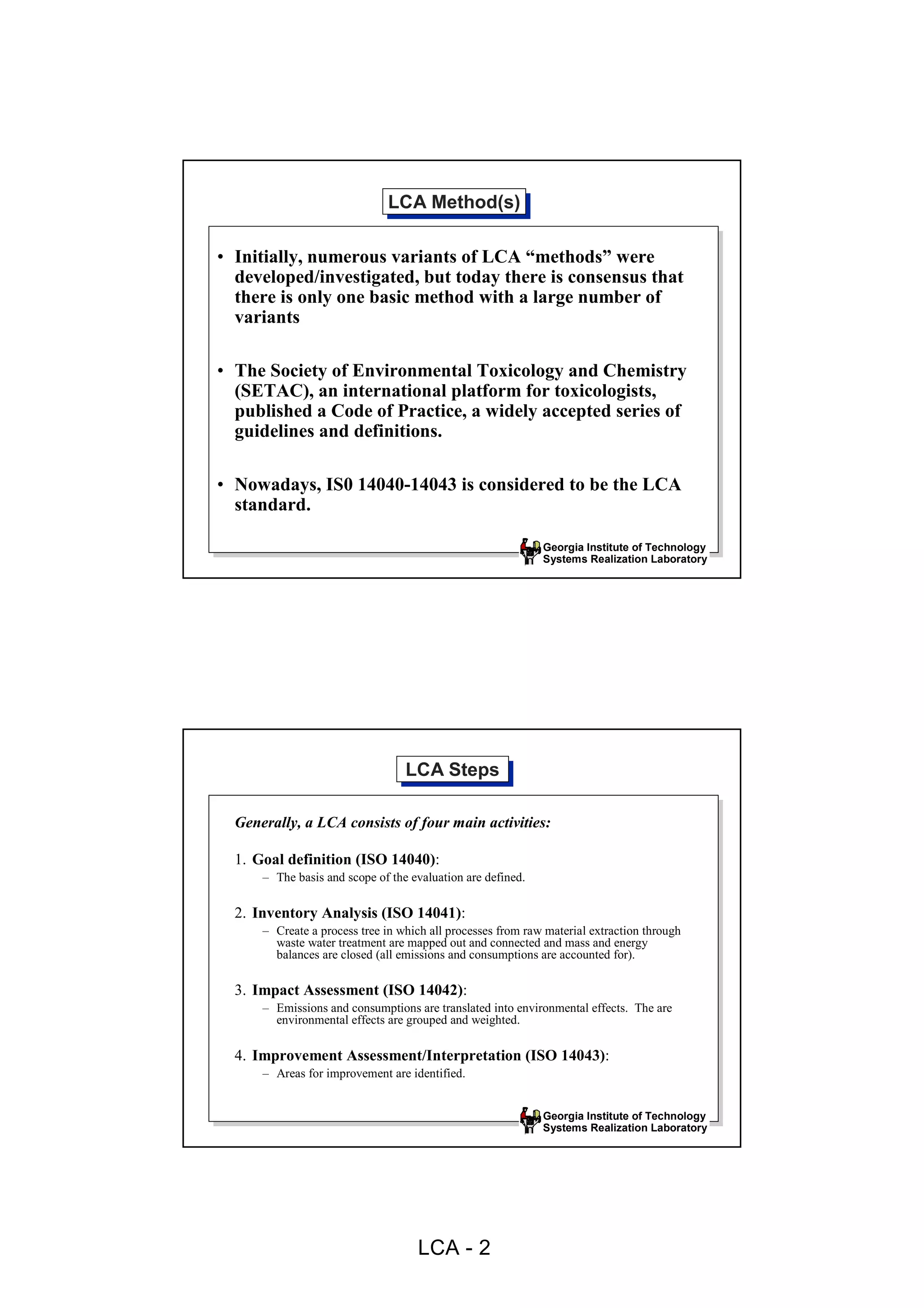 2) The LCA process consists of four main steps: defining the goal and scope of the analysis, conducting an inventory of material and energy inputs/outputs, assessing the environmental impacts, and interpreting the results to identify areas for improvement.