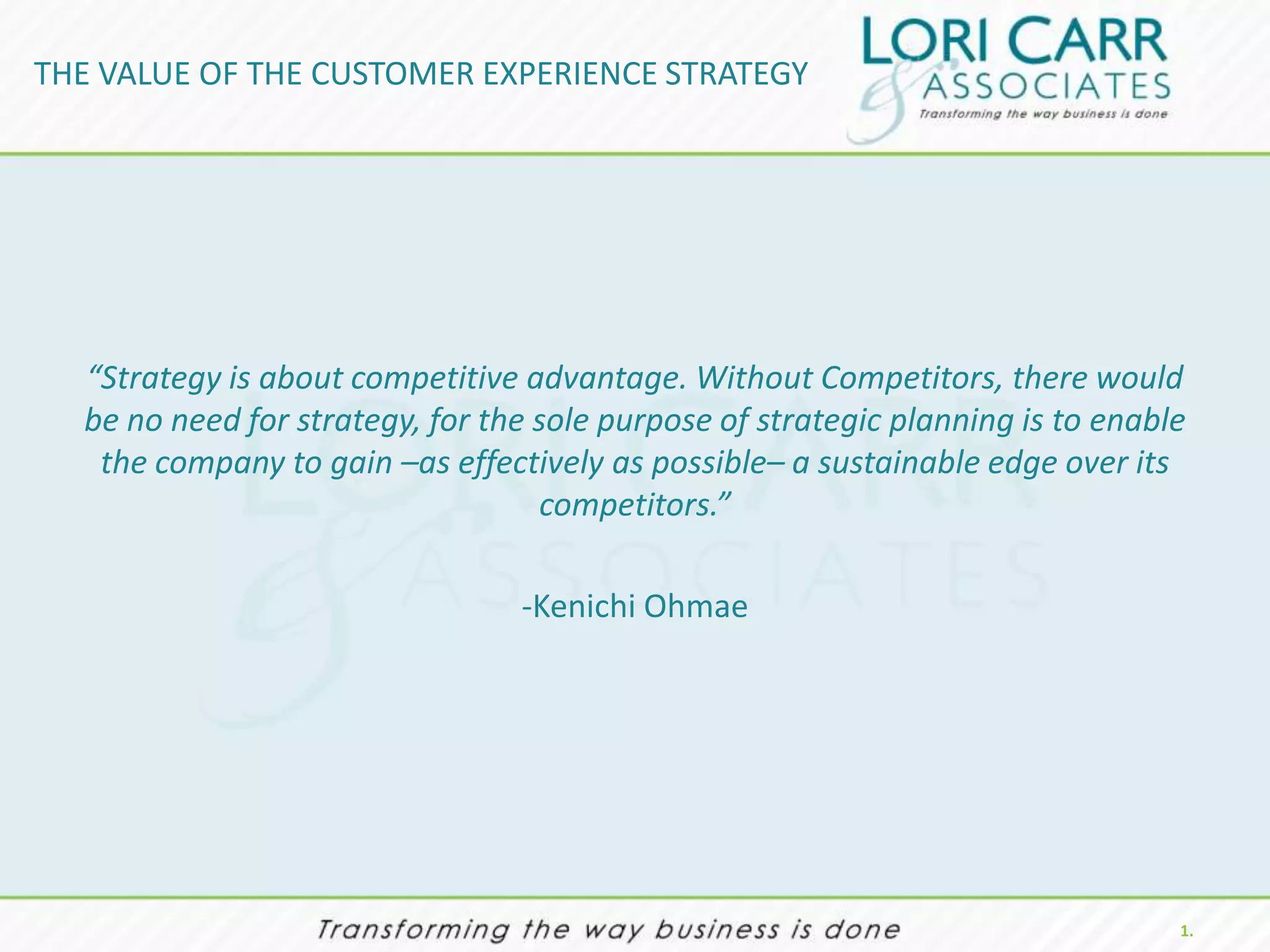 This document outlines key elements of a successful customer experience strategy. It discusses the importance of having a senior customer experience leader to develop the strategy and ensure accountability. The strategy should define the company's mission, vision, and annual plans. It also recommends mapping the customer journey, simplifying processes, assessing maturity levels, and sharing accountability across functions. Regularly capturing customer feedback through programs like Voice of the Customer is also presented as important. The overall message is that an effective customer experience strategy can increase revenues and loyalty.