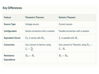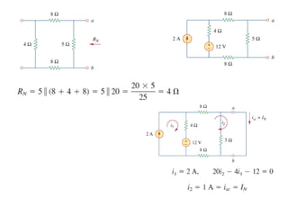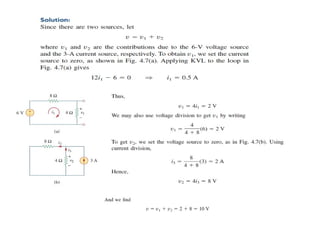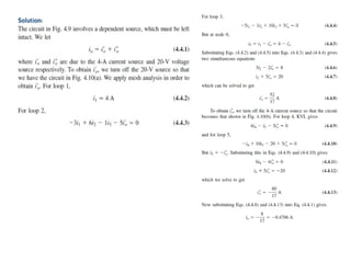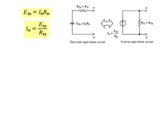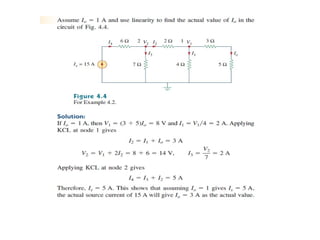The document discusses various methods of linear circuit analysis, including linearity property, superposition, source transformation, Thevenin's theorem, and Norton's theorem. It explains key concepts such as the relationship between input and output in linear circuits, steps to apply superposition, and how to derive equivalent circuits using Thevenin and Norton methods. Examples illustrate the application of these principles to determine circuit parameters and contributions from independent sources.