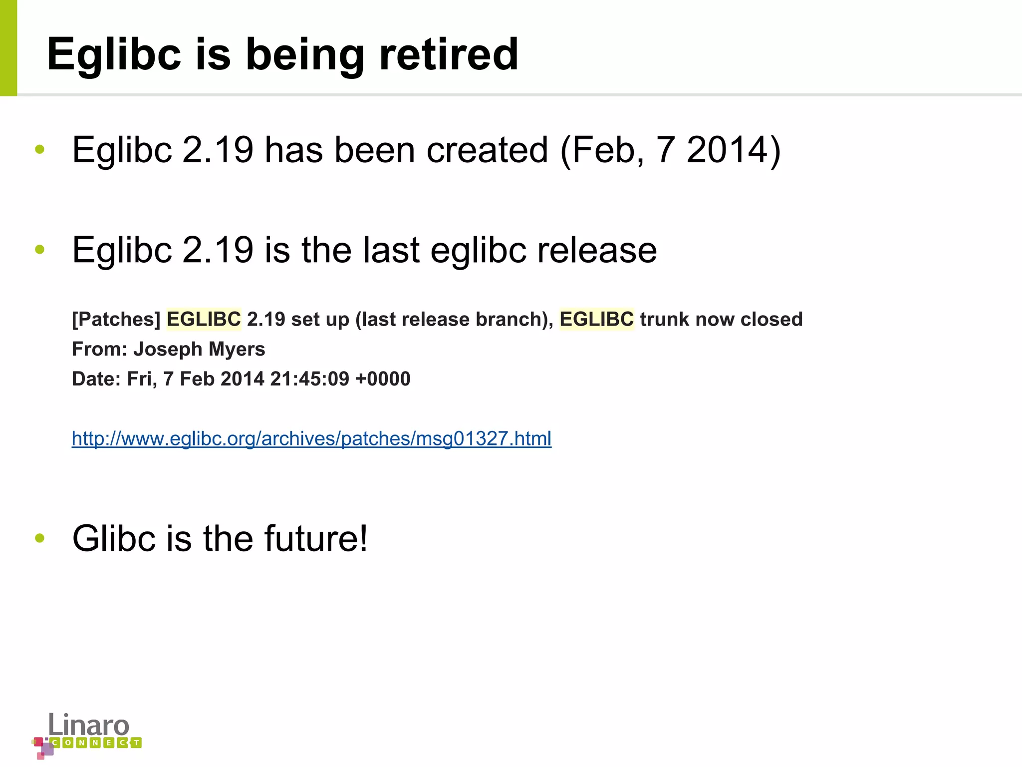 Eglibc 2.19 was the last release of eglibc. Future releases will use glibc instead as the default C library. Glibc has improved support for embedded systems so eglibc is no longer needed. Linaro will transition their toolchains to glibc starting with glibc 2.19 in their July 2014 release. This transition to glibc shouldn't cause issues for most users.