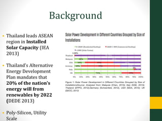 This document summarizes a life cycle assessment of a 21 MW solar photovoltaic farm in Suphanburi, Thailand. It finds that producing the solar panels in Thailand results in significantly lower environmental impacts than producing them in Australia due to differences in the countries' electricity grid mixes. Specifically, the study shows that greenhouse gas emissions are 18 times lower when produced in Thailand. It also determines that the manufacturing/production phase contributes most emissions over the solar farm's lifetime and that the system will offset 498,000 tons of carbon dioxide emissions over 30 years of operation.