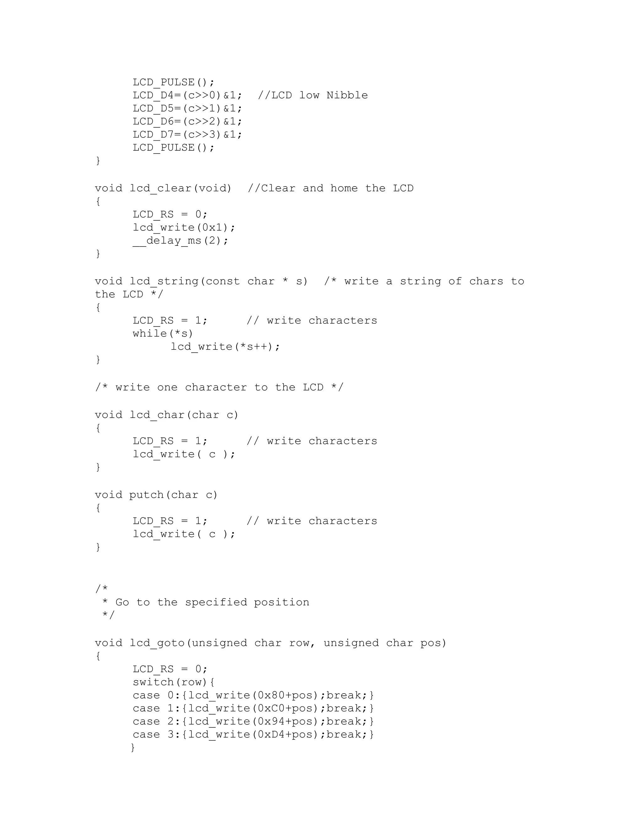 This document contains code for interfacing with an LCD display using a Hitachi HD44780 controller in 4-bit mode. It includes function definitions for initializing the LCD, writing data, clearing the screen, writing strings and characters to specific positions on the LCD. The main function calls lcd_init() to initialize the LCD, then uses printf() to write strings at different positions on the LCD to display text for testing the LCD interface.