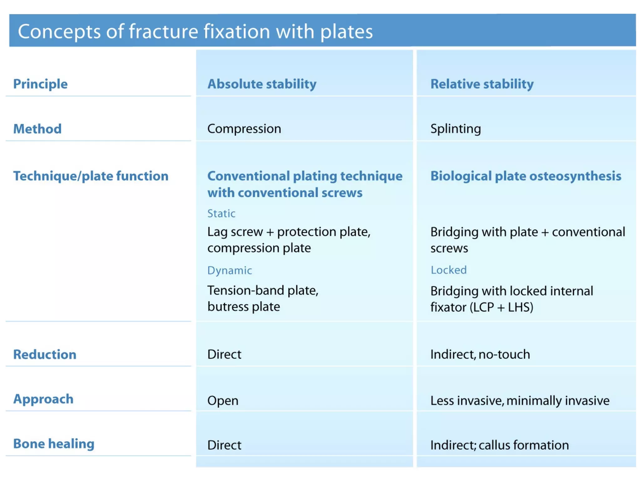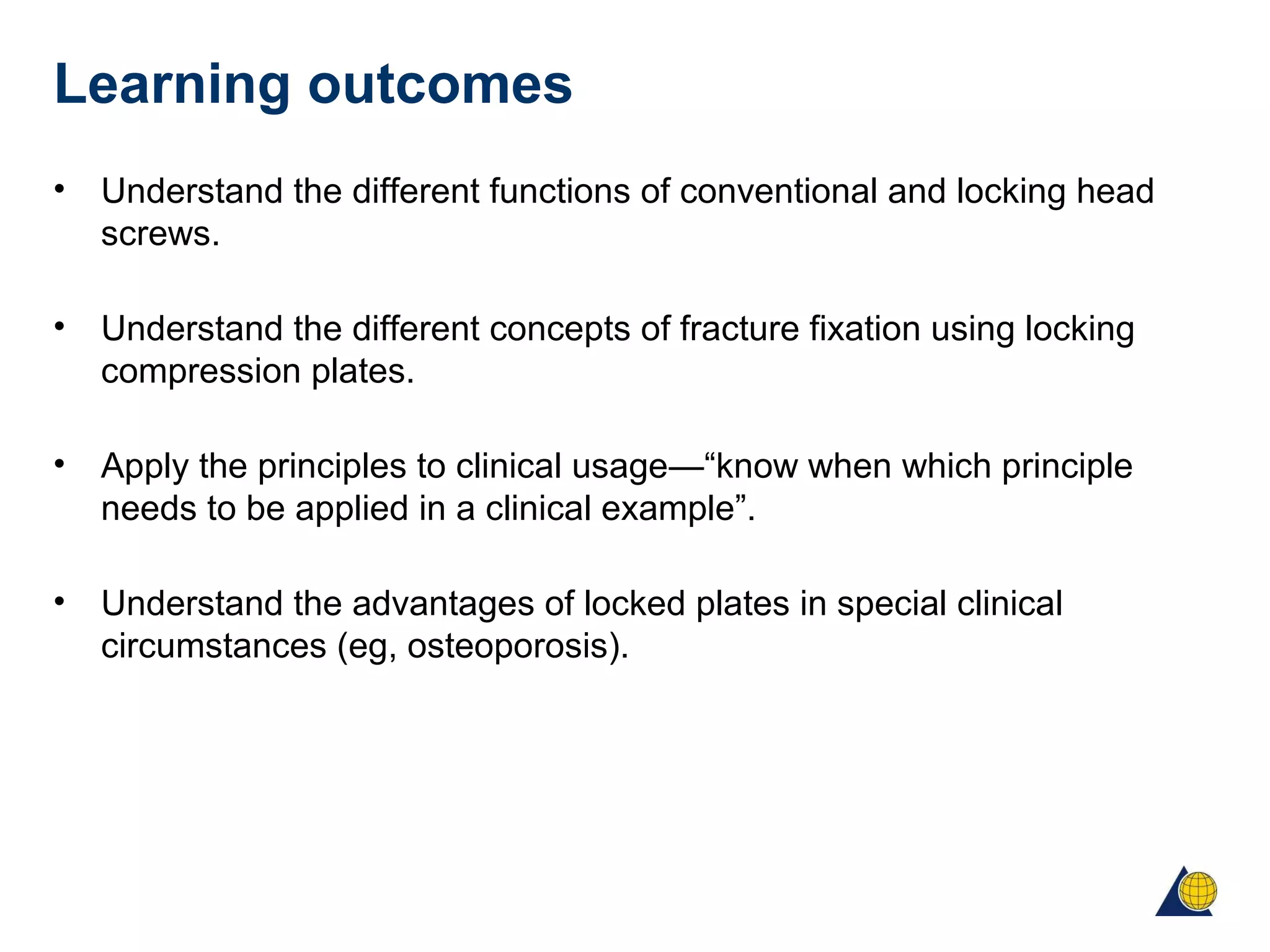 This document provides an overview of fracture fixation using locking compression plates (LCP). It discusses the different principles of fixation, including compression for absolute stability and splinting for relative stability. Compression plates use conventional screws and interfragmentary compression, while locked plates utilize locking head screws to provide angular stability without compression. Certain fractures are best treated with compression and direct bone healing, while others such as multifragmentary or osteoporotic fractures are better suited to splinting and indirect healing with locked plating. Both techniques can be combined in segmental fractures involving different zones.