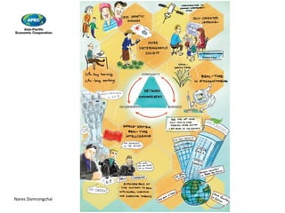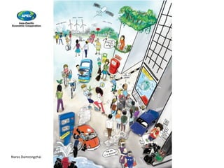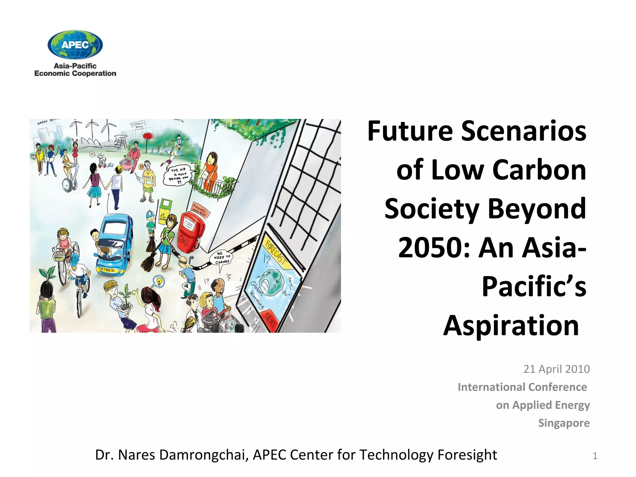 The document summarizes the findings of a real-time Delphi survey and scenario workshop regarding future low-carbon societies in Asia-Pacific beyond 2050. The survey and workshop engaged international experts who identified key trends and events, and their level of agreement on the feasibility and desirability of various statements. While experts were optimistic about technologies to improve healthcare and energy efficiency, they had doubts about carbon capture and widespread algae fuel. They also foresaw conflicts from climate migration and water scarcity.