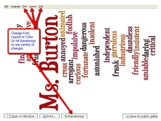 Valerie Burton presented on tools for integrating technology into lessons at the LCTE Fall Conference. She introduced Google Docs for collaboration and gathering information through forms. Weebly was presented for ePortfolios and websites. Wordle was shown for avatars, presentations, and assessments. Kidblog and Wordpress were recommended for blogs. Photopeach allows creating photomovies. Twitter is useful for updates. PBWorks creates online classrooms. Wallwisher gathers ideas. Demonstrations and explanations were provided for each tool. The goal was to help educators effectively incorporate new technologies into teaching and managing learning.
