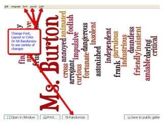 Valerie Burton, an AP Literature and English IV teacher from New Orleans, presented at the LCTE Fall Conference in Lafayette, Louisiana on October 19, 2012. She demonstrated various free online tools for teachers to integrate technology into their lessons, including Google Docs for collaboration, Weebly for student ePortfolios, Wordle for presentations, Kidblog for student blogs, and Twitter to communicate with students. Burton also shared specific ways she uses these tools like Google Forms for surveys and Wordpress for assignment blogs.