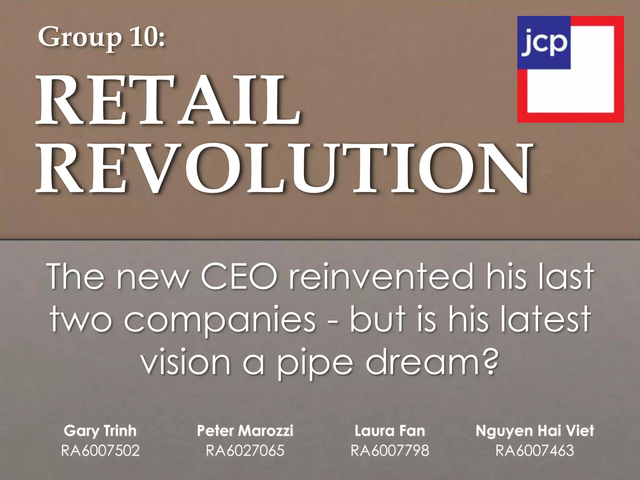 Ron Johnson was hired as CEO of JCPenney in 2011 to transform the struggling 110-year old retailer. He aimed to target all income classes instead of just lower-middle incomes and eliminate sales and coupons in favor of "fair prices" displayed openly. However, after the first quarter, sales dropped 20% as customers disliked the pricing changes and store layout became confusing without signs. While some praised Johnson's vision to modernize, the board faced a decision whether to replace him or let him continue his transformation plan.