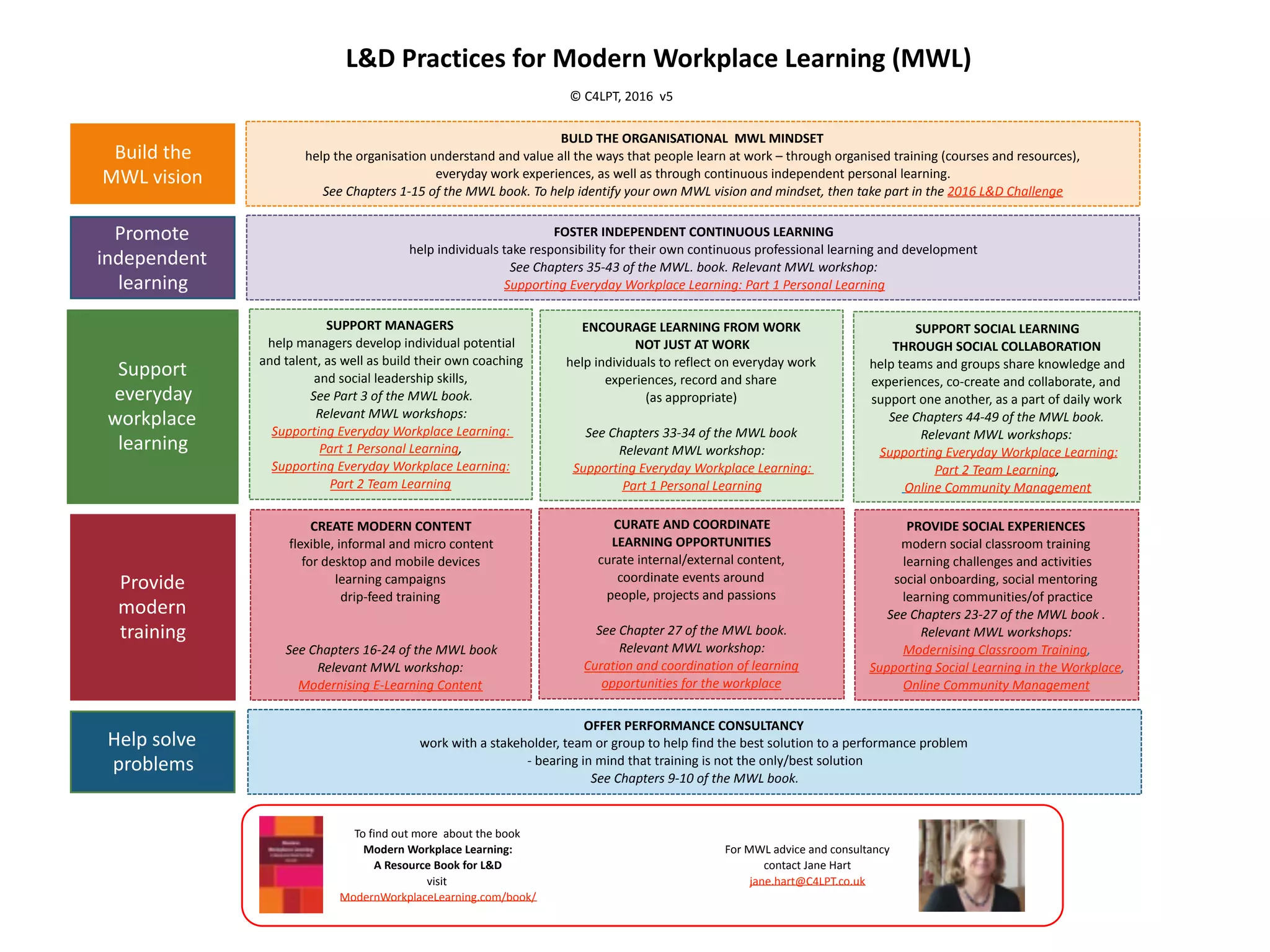 The document outlines strategies for modern workplace learning (MWL) that encompass flexible, informal, and micro content for both desktop and mobile platforms. It emphasizes the importance of supporting managers and fostering independent learning while incorporating social collaboration and everyday work experiences for continuous professional development. Additionally, it references various chapters from the MWL book and associated workshops to promote effective learning practices in organizations.