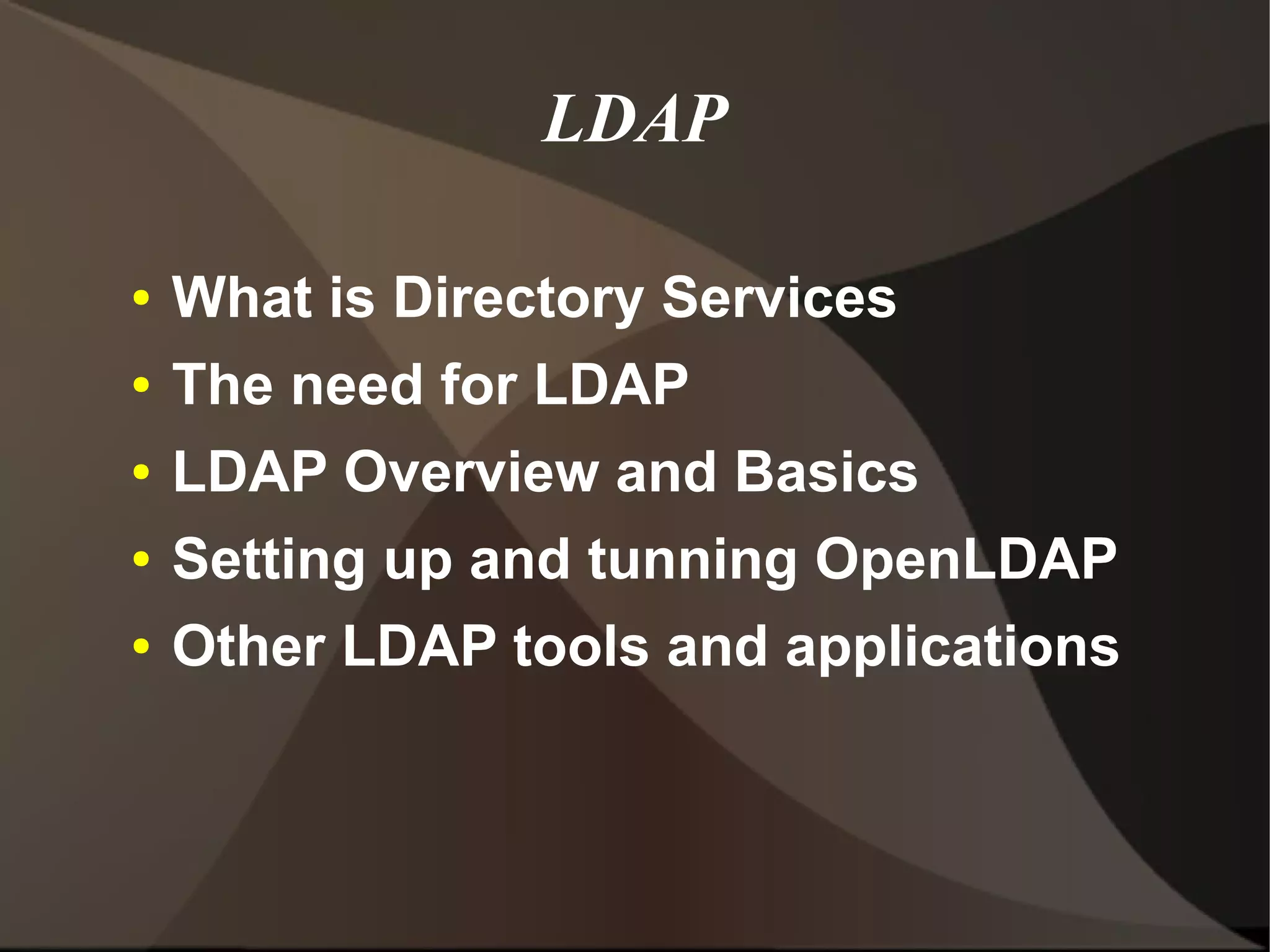 This document provides an overview of LDAP (Lightweight Directory Access Protocol). It discusses directory services and the need for LDAP, provides an introduction to LDAP including its benefits and basics, and covers setting up and tuning OpenLDAP as well as other LDAP tools and applications.